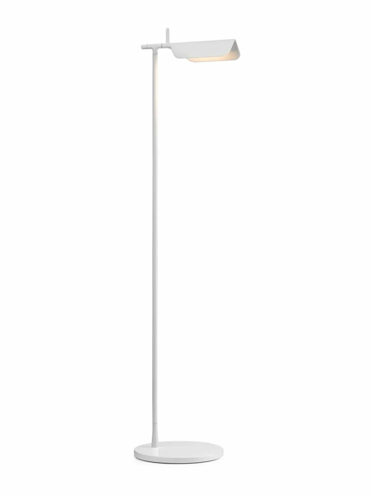Näyttävä ulkomuoto ja käytännöllisyys yhdistyvät Flosin Tab Floor -lattiavalaisimessa. Varjostin kääntyy 45 astetta, joten valon saa aina kohdistettua oikeaan kohtaan. Suunnittelu Edward Barber & Jay Osgerby, 2011.