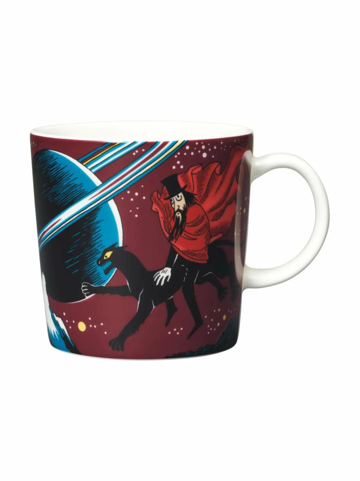 Salaperäinen taikuri on liikkeellä pantterinsa kanssa. Mukin on kuvittanut Tove Slotte, alkuperäinen kuvamateriaali löytyy Tove Janssonin kirjasta Taikurin hattu. Arabian Muumi-astiat ovat uunin-, mikroaaltouunin- ja konepesunkestävää keramiikkaa. Ne kestävät myös ruoan pakastamisen.