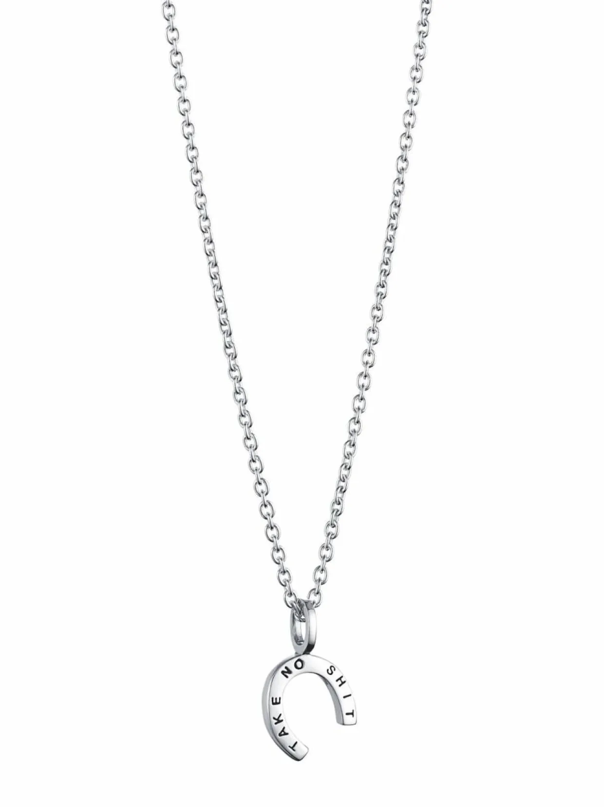 Tyylikkäässä hopeakaulakorussa on hevosenkengän muotoinen riipus, jossa on teksti ″Take No Shit″. Ketjun pituus on 45 cm.
