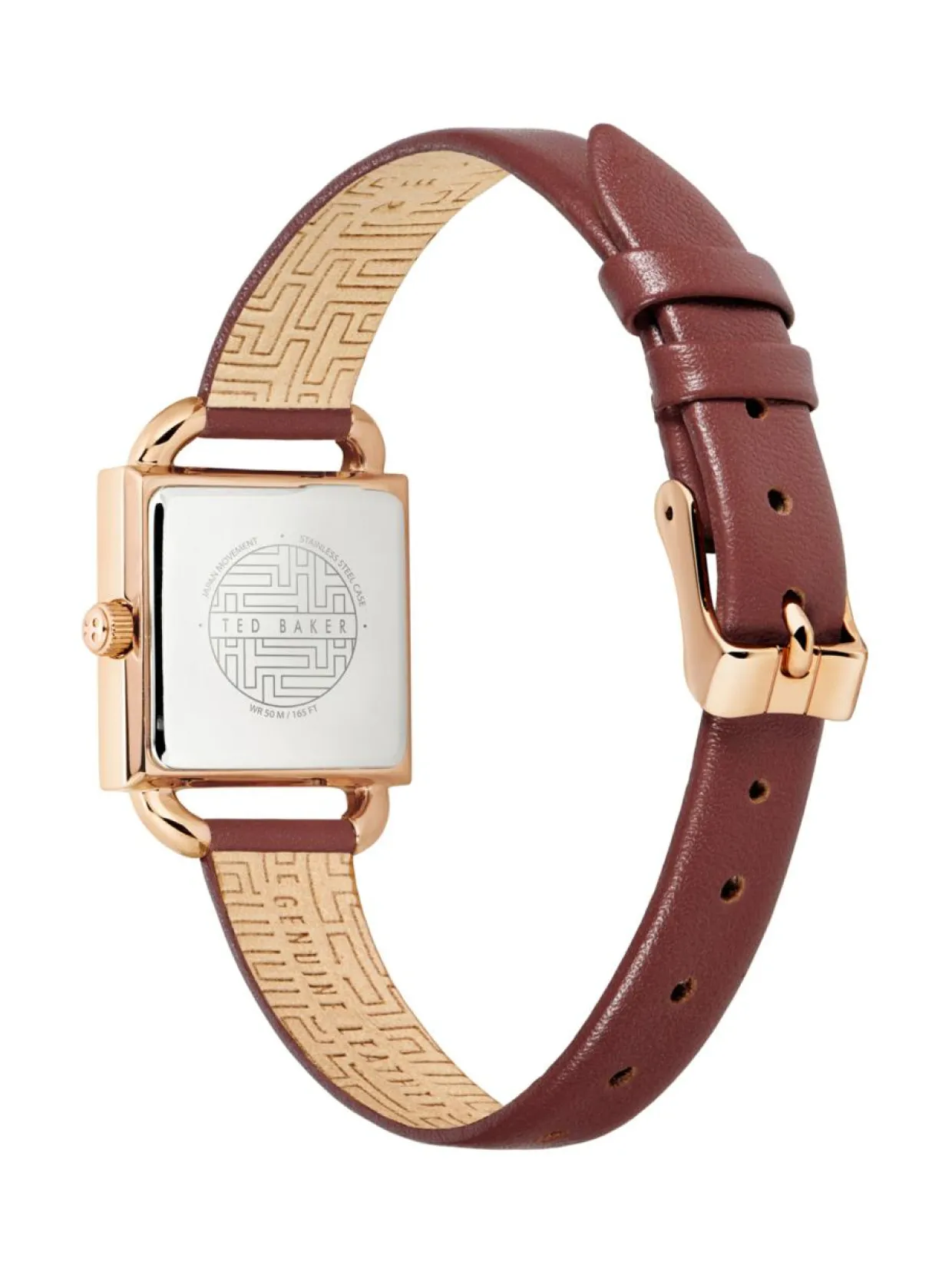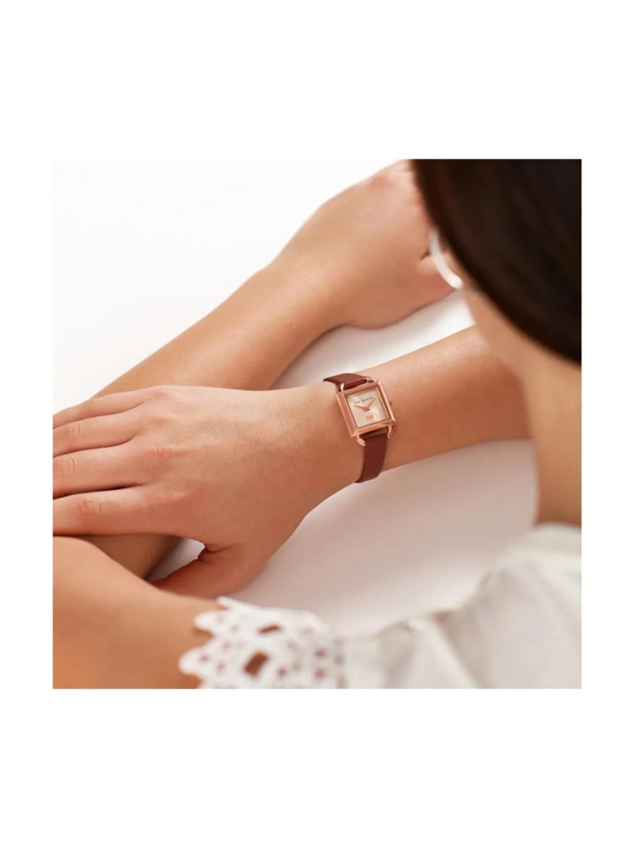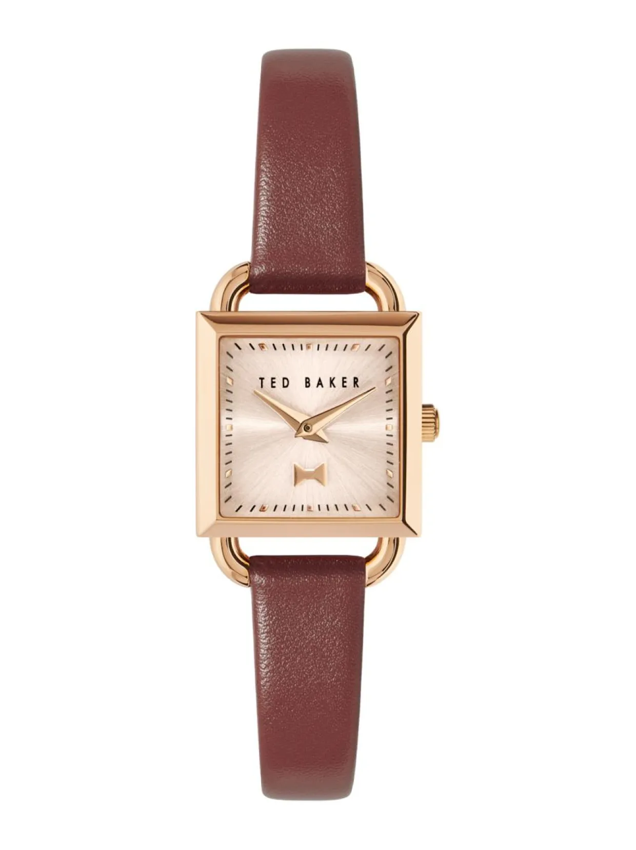 Ted Baker Taliah Bow-mallisto on naisellisen elegantti neliskanttisella muodollaan. Kellon ruusukullanvärinen runko on valmistettu ruostumattomasta teräksestä ja sen leveys on 24mm ja paksuus on 7mm. Kellossa on ruskea nahkaranneke. Kellon taulu on ruusukullanvärinen, jossa on ruusukullanvärinen rusetti yksityiskohtana. Kellossa on mineraalilasi ja kvartsikoneisto. Kellon vesitiiviys on 5ATM. Ted Baker kelloilla on 2 vuoden takuu.