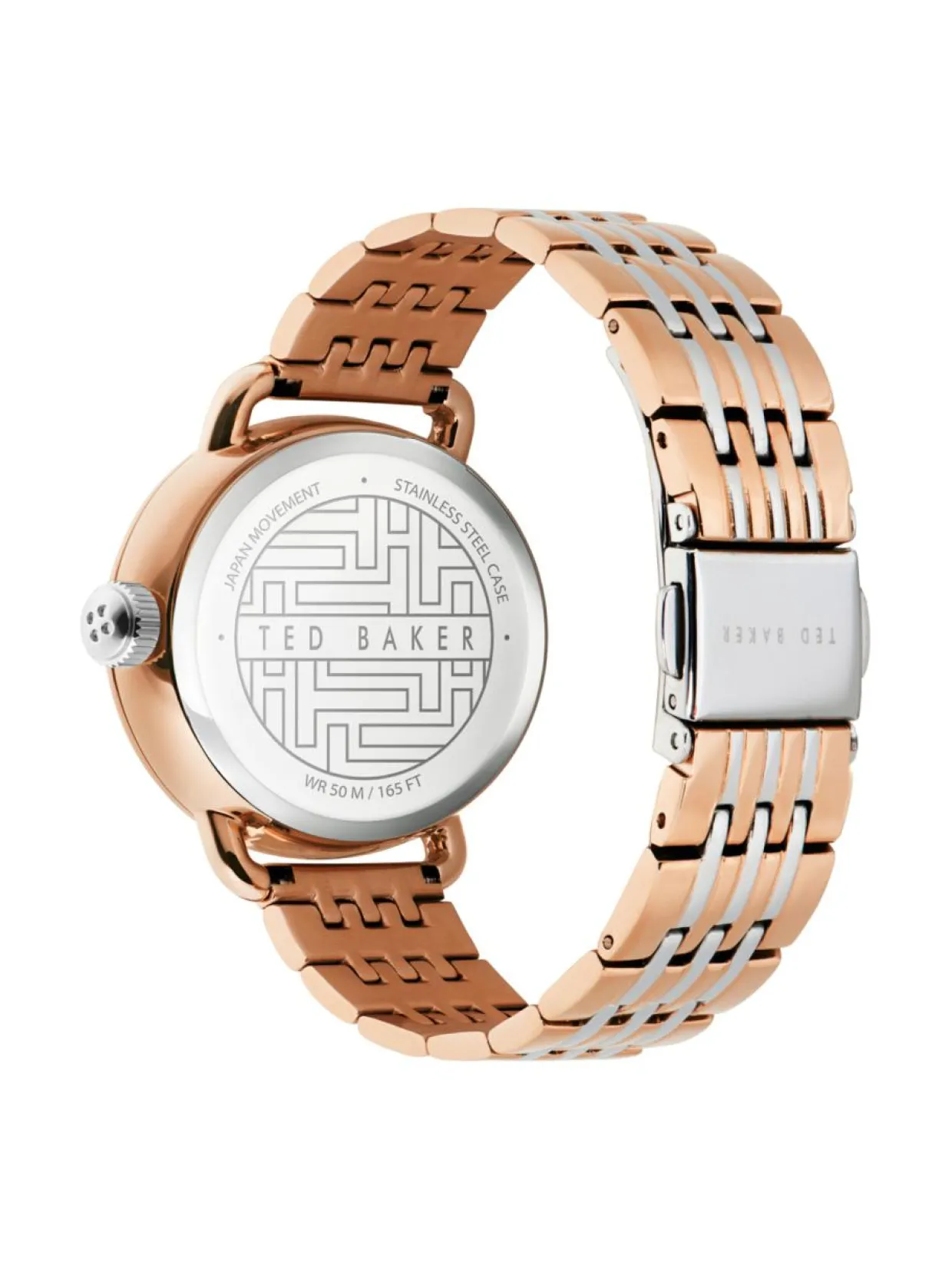 Ted Baker Classic 34,5mm rannekello on monikäyttöinen kello arkeen ja juhlaan. Kellon ruusukullanvärinen runko on valmistettu ruostumattomasta teräksestä. Sen leveys on 34,5mm ja paksuus on 8,5mm. Tässä kellossa on ruusukullan- ja hopeanvärinen metalliranneke, joka on valmistettu ruostumattomasta teräksestä. Kellon kehällä on kristalleja. Kellossa on hopeanvärinen taulu, jossa sekuntiviisarin ympyrä on glitterillä koristeltu. Kellossa on mineraalilasi ja kvartsikoneisto. Kellon vesitiiviys on 5ATM. Ted Baker kelloilla on 2 vuoden takuu.