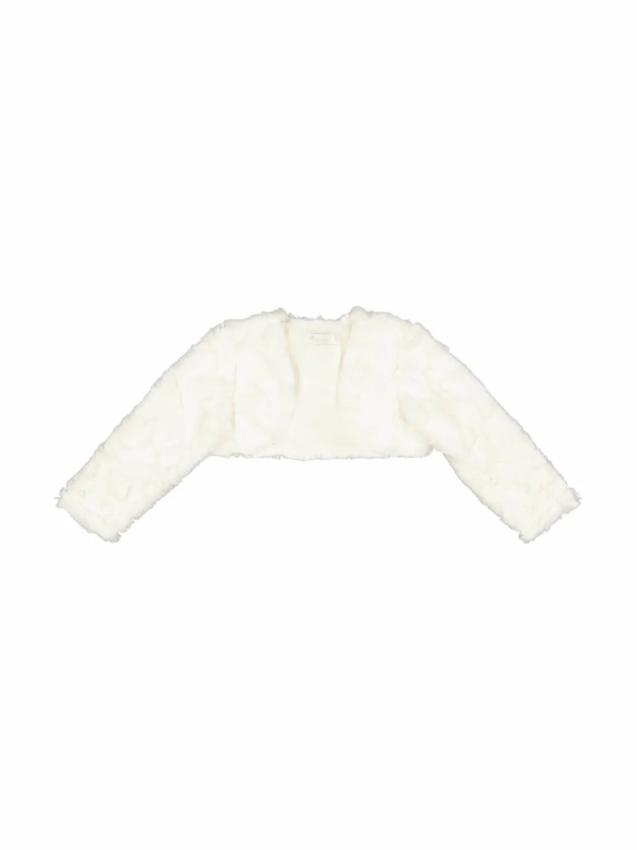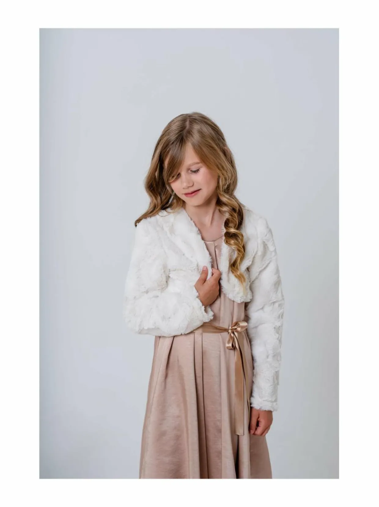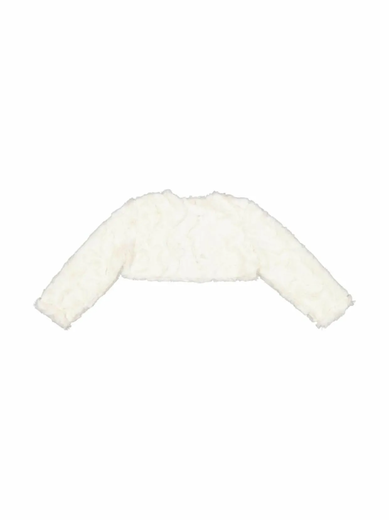 Lyhythelmainen Mignelin-bolero on valmistettu ihanan pörröisen pehmeästä tekoturkiksesta. Vuori on sileäpintaista kangasta. Tekoturkisbolero viimeistelee lapsen juhlaasun ihastuttavasti.