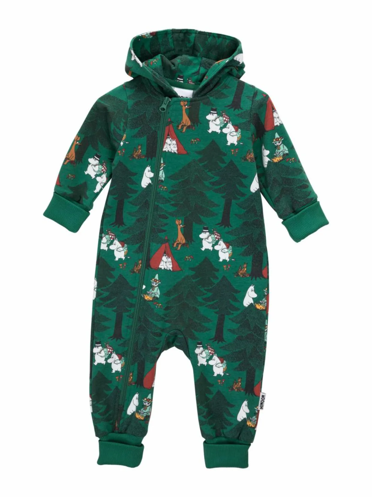 Vauvojen hupullinen haalari, jossa on pitkä vetoketju sekä käännettävät resorit hihansuissa ja lahkeissa. Haalarin kuosi kuvastaa muumien telttailuretkeä. Monikäyttöinen haalari sopii autoreissuille, viileämpiin päiviin, kauppaan tai vaunuihin päiväunien ajaksi. Materiaalin puuvilla on luomutuotettua.