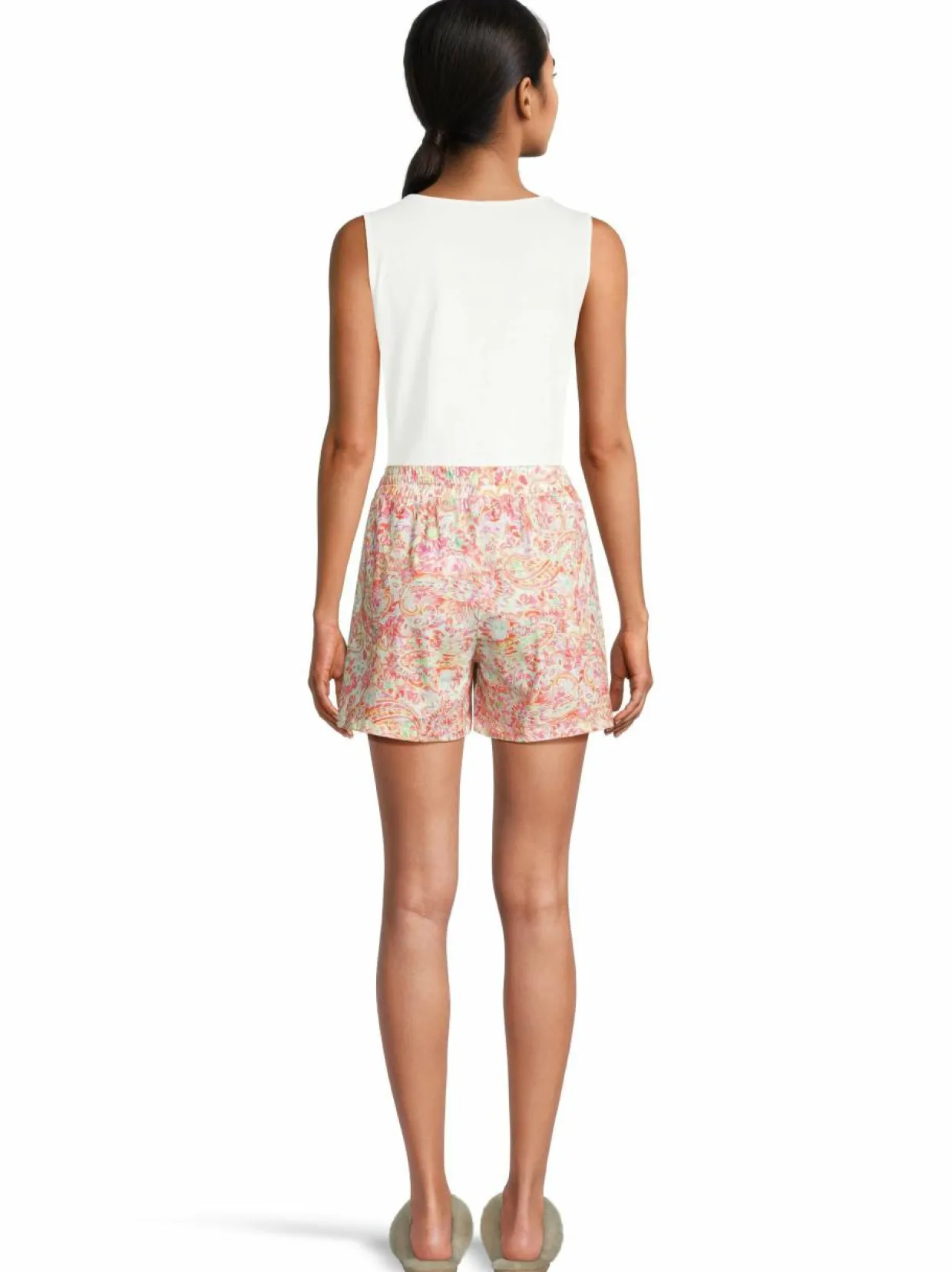 Kesäiset A+more merkin shortsit on valmistettu pehmeästä ja hengittävästä luomupuuvillasta. Niissä on mukavan rento lahje ja joustava sekä säädettävä vyötärölinja. Ne sopivat täydellisesti kotoisan rentoihin oleiluhetkiin, nukkumiseen sekä vapaa-aikaan.