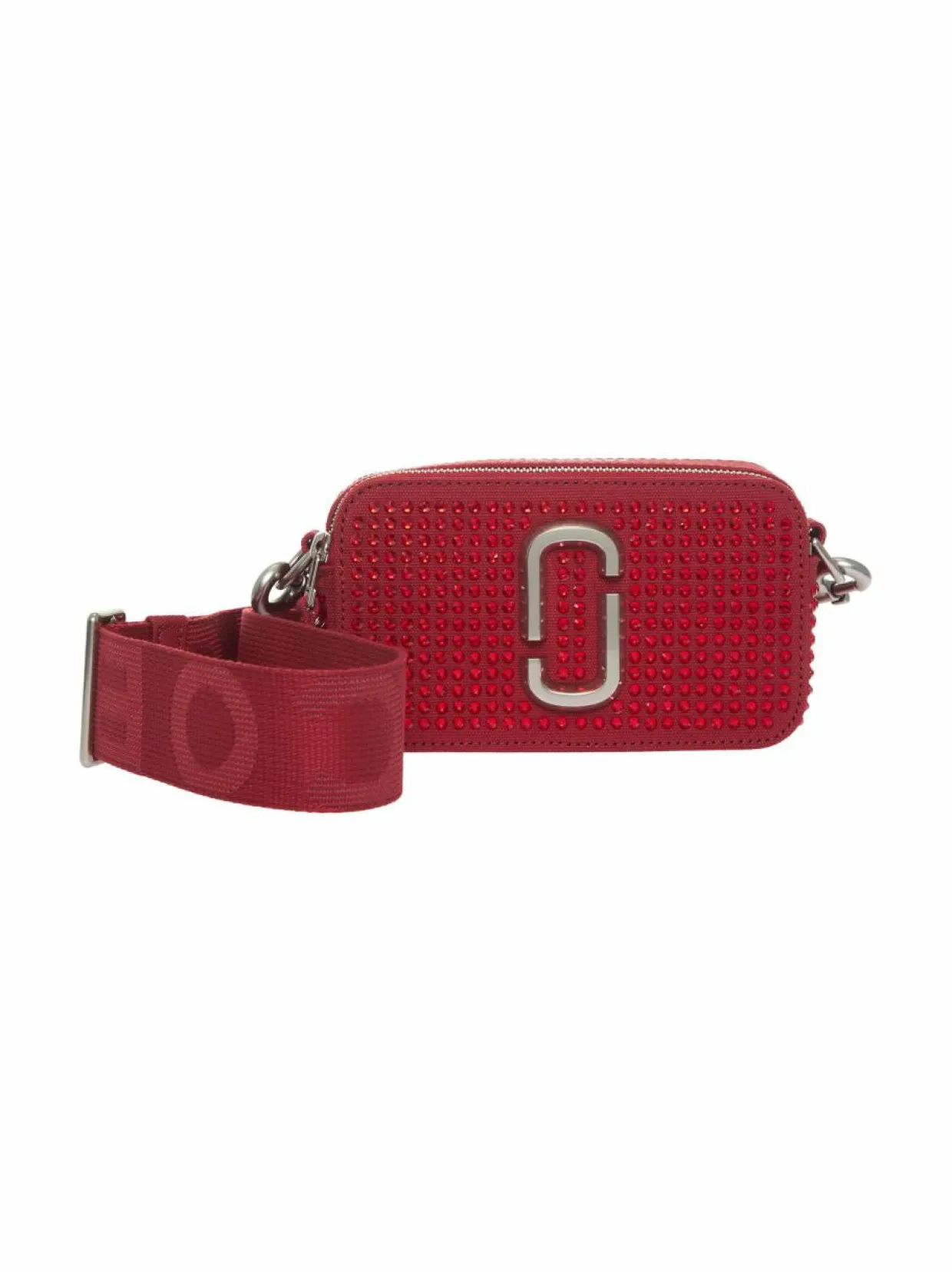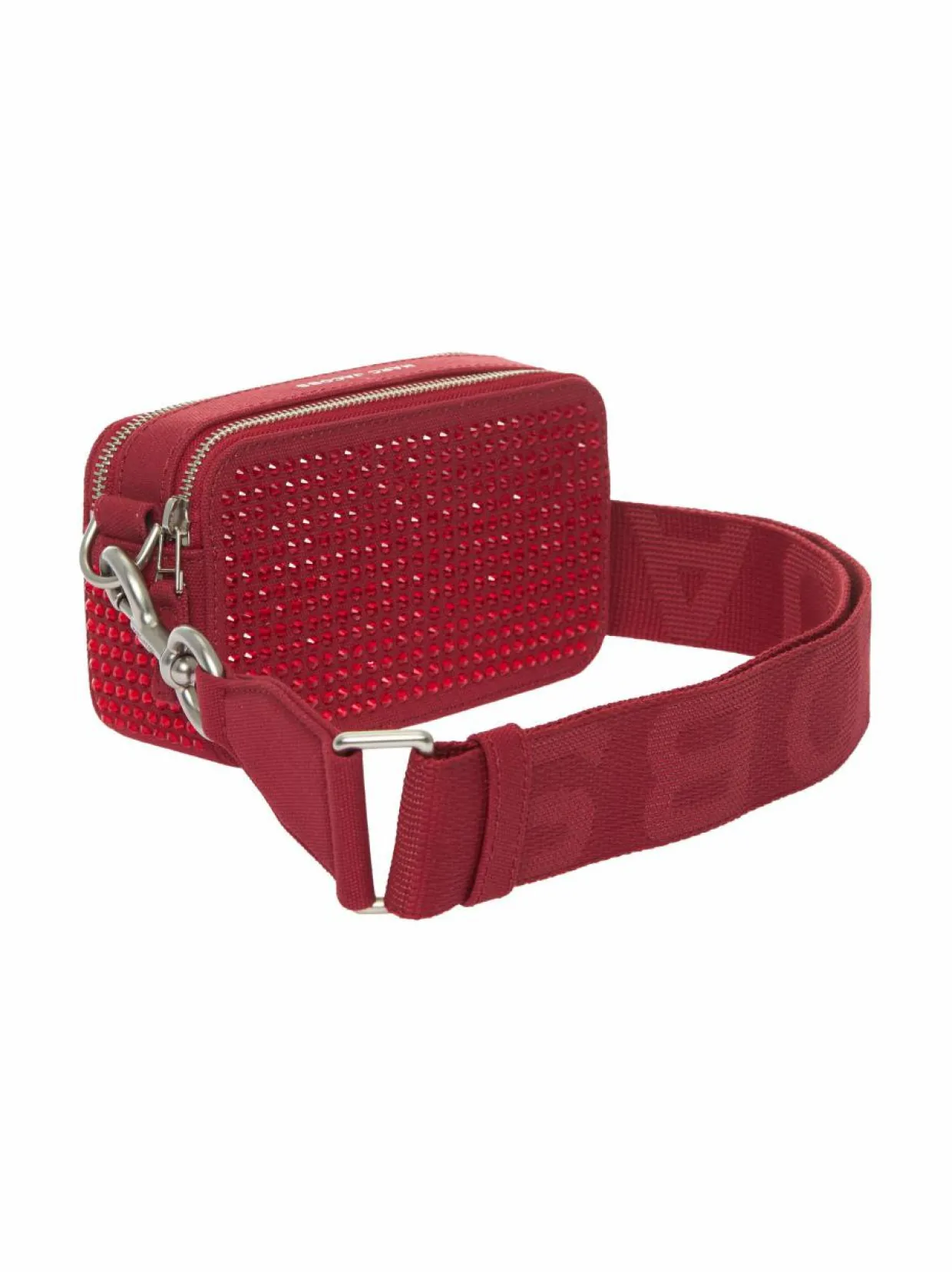 Marc Jacobs merkin kompakti kameramallinen olkalaukku koristekivillä. Tekstiililaukussa on kahdella vetoketjulla suljettava päälokero. Olkahihna on irrotettava sekä säädettävä, joten voit käyttää laukkua joko kädessä, olalla tai crossbody-mallisena rinnan halki.