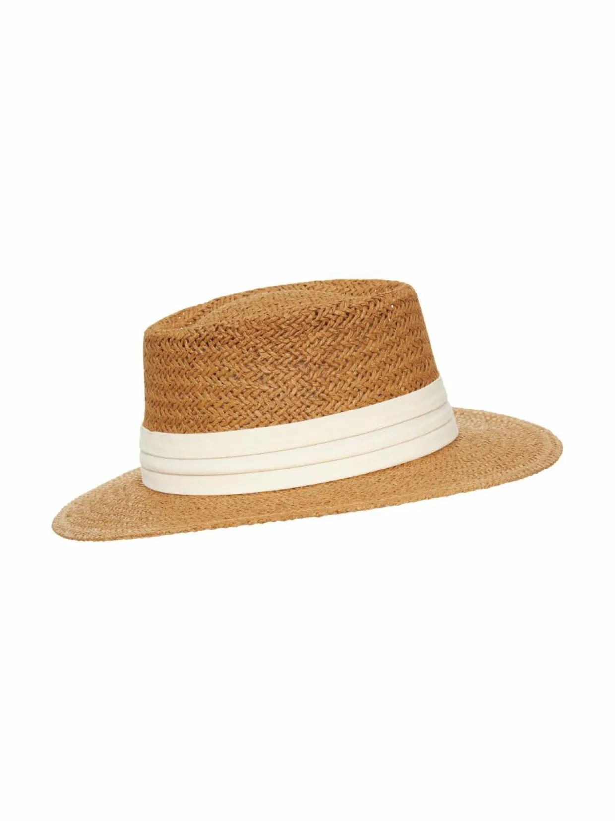 Klassisen mallinen kesähattu soveltuu lämpimiin hellepäiviin, rannalle sekä kaupungille. Hatussa tyylikäs koristenauha.