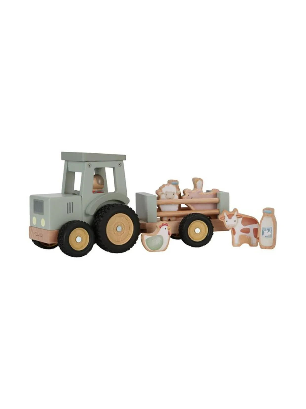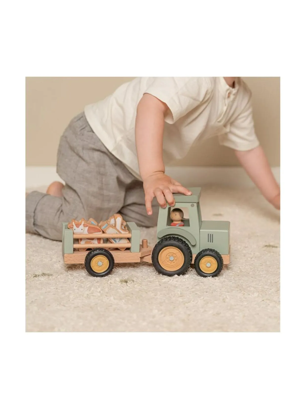 Little Dutch puinen Traktori + peräkärry on osa uutta Farm -sarjaa. Mukana tulee traktorin ja peräkärryn lisäksi erilaisia farmin asukkeja, joita voi kuljettaa peräkärryssä. Lelu kehittää lapsen mielikuvitusta, sekä käsi-silmä -koordinaatiota.Lisätietoja: