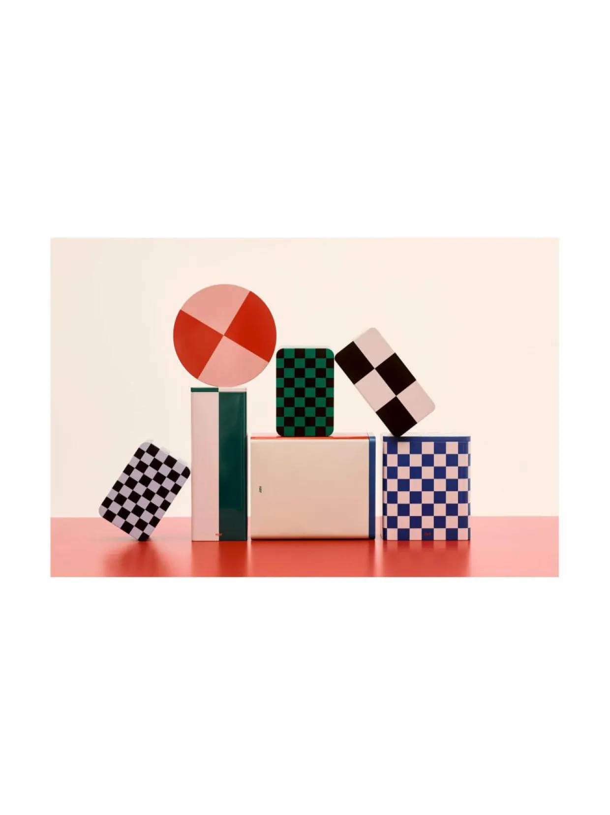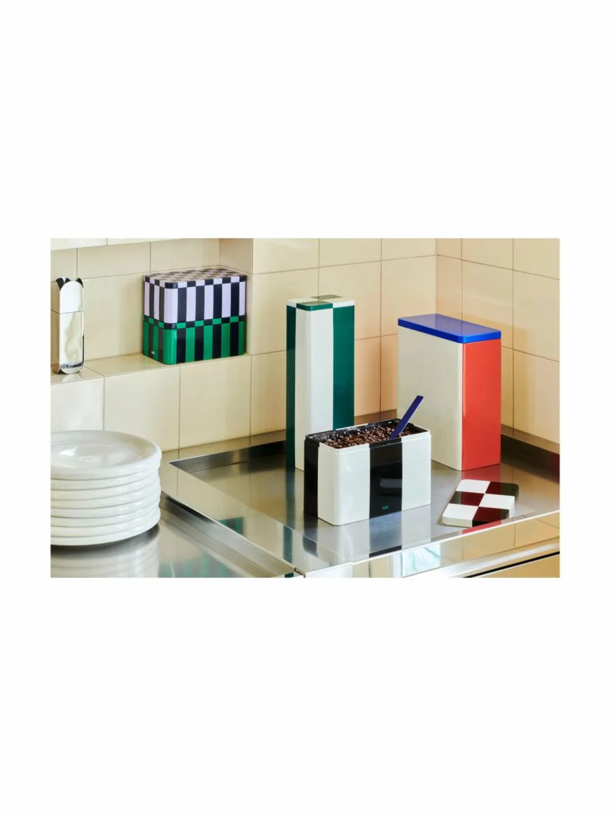 HAY:n Tin Container -sarjan säilytyslaatikot ovat sekä käytännöllisiä että koristeellisia. Laatikoissa on värikkäitä ruudukoita ja kiiltävä pinta. Kansi ja laatikko ovat tasaisesti kohdakkain, mikä luo tyylikkään ja saumattoman ulkonäön ja varmistaa samalla tiiviin istuvuuden, sopien kuiville elintarvikkeille. Tin Container -laatikot ovat saatavana monissa eri ko’oissa, muodoissa ja malleissa, ja ne voidaan asettaa koristeellisesti hyllyille tai pöydille ympäri kotia eri esineiden säilyttämiseen ja järjestämiseen.