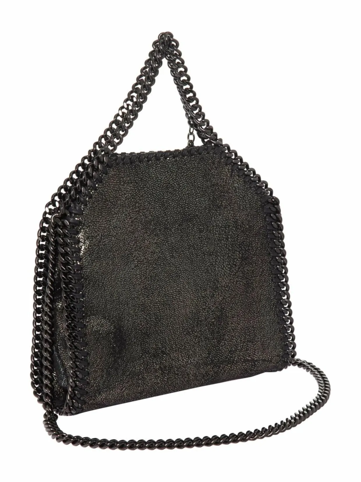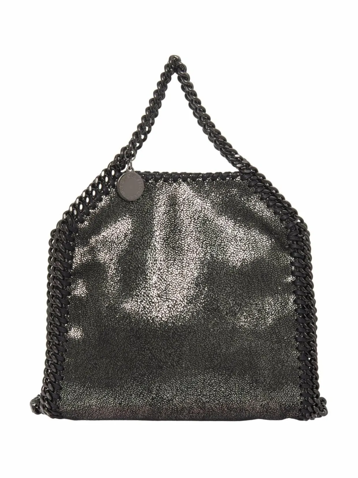 Stella McCartneyn Tiny Shiny Dotted Tote -laukun pinta on koristeltu kiiltävin pistein. Laukun reunojen ympärille on kiinnitetty ketjua ja nauhaa, jotka antavat laukulle sen ikonisen tyylin. Olkahihna ja kantolenkit ovat myös metalliketjua.