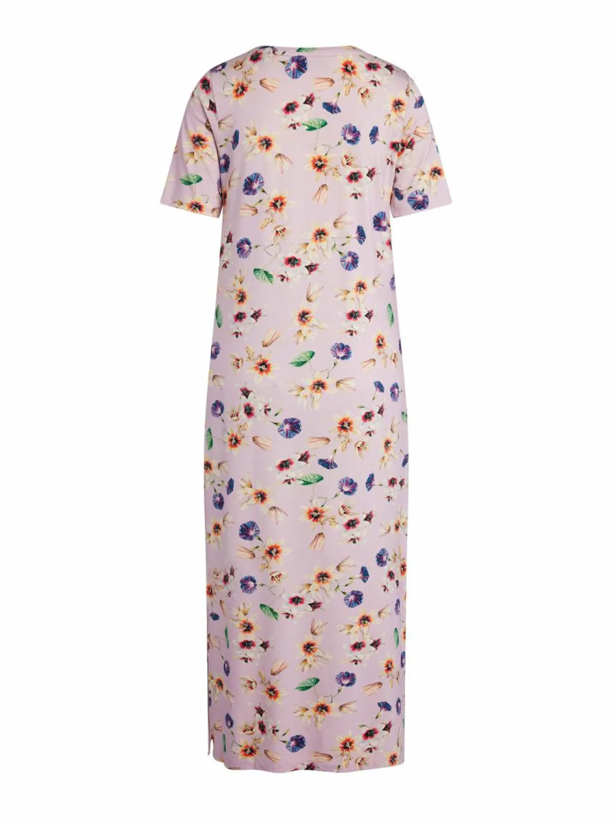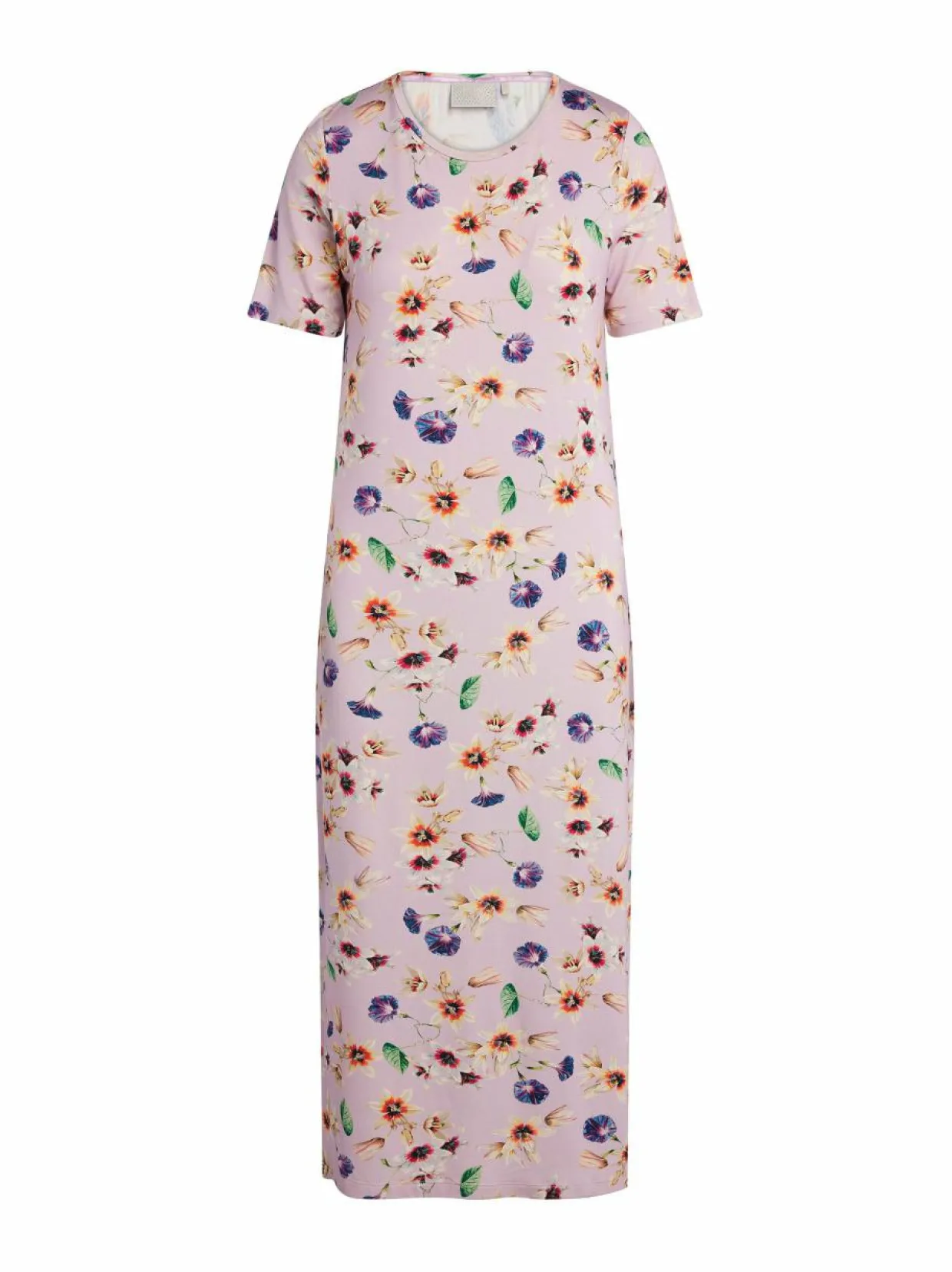 Suloisella kukkakuosilla koristeltu yöpaita Essenza merkiltä. Titia Fiorre -yöpaita on valmistettu pehmeästä ja hengittävästä Lenzing Ecovero -viskoosista, johon elastaani lisää mukavasti joustoa. Tämä mukava trikoomekko on suunniteltu tyköistuvaan istuvuuteen. Ihanteellinen valinta nukkumiseen, kotoisan rentoihin oleiluhetkiin sekä kesätapahtumiin.