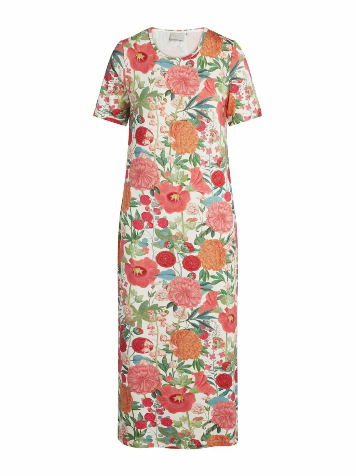 Viehättävällä kukkakuosilla koristeltu yöpaita Essenza merkiltä. Titia Florentien -yöpaita on valmistettu pehmeästä ja hengittävästä Lenzing Ecovero -viskoosista, johon elastaani lisää mukavasti joustoa. Tämä mukava trikoomekko on suunniteltu tyköistuvaan istuvuuteen. Ihanteellinen valinta nukkumiseen, kotoisan rentoihin oleiluhetkiin sekä kesätapahtumiin.