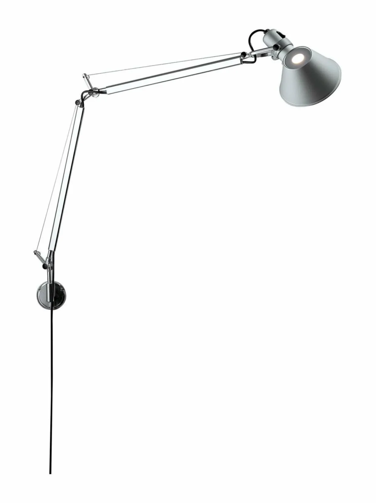 Tolomeo Mini Parete -valaisimen kartionmuotoinen varjostin on alumiinia, ja tunnusomaisen vaijerirakenteen ansiosta valon suuntaa on helppo muunnella tarpeen mukaan.