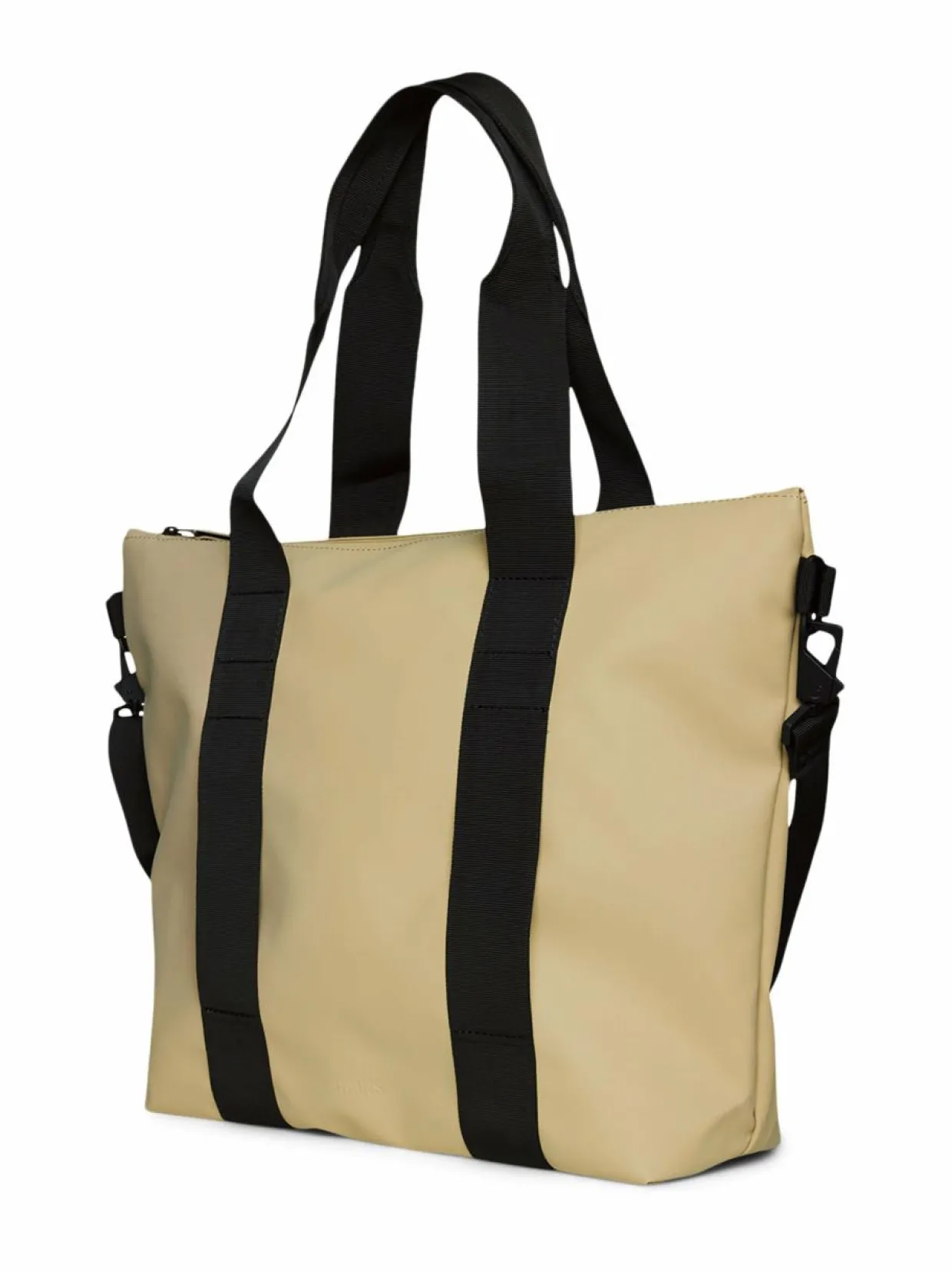 Rainsin vedenkestävä tote-mallinen laukku irrotettavalla olkahihnalla. Kantokahvat ovat kiinteät. Sisäpuolelta löydät pääosion lisäksi avonaisen lisätaskun. Mitat: Korkeus 36, leveys 35 cm, syvyys 13 cm.