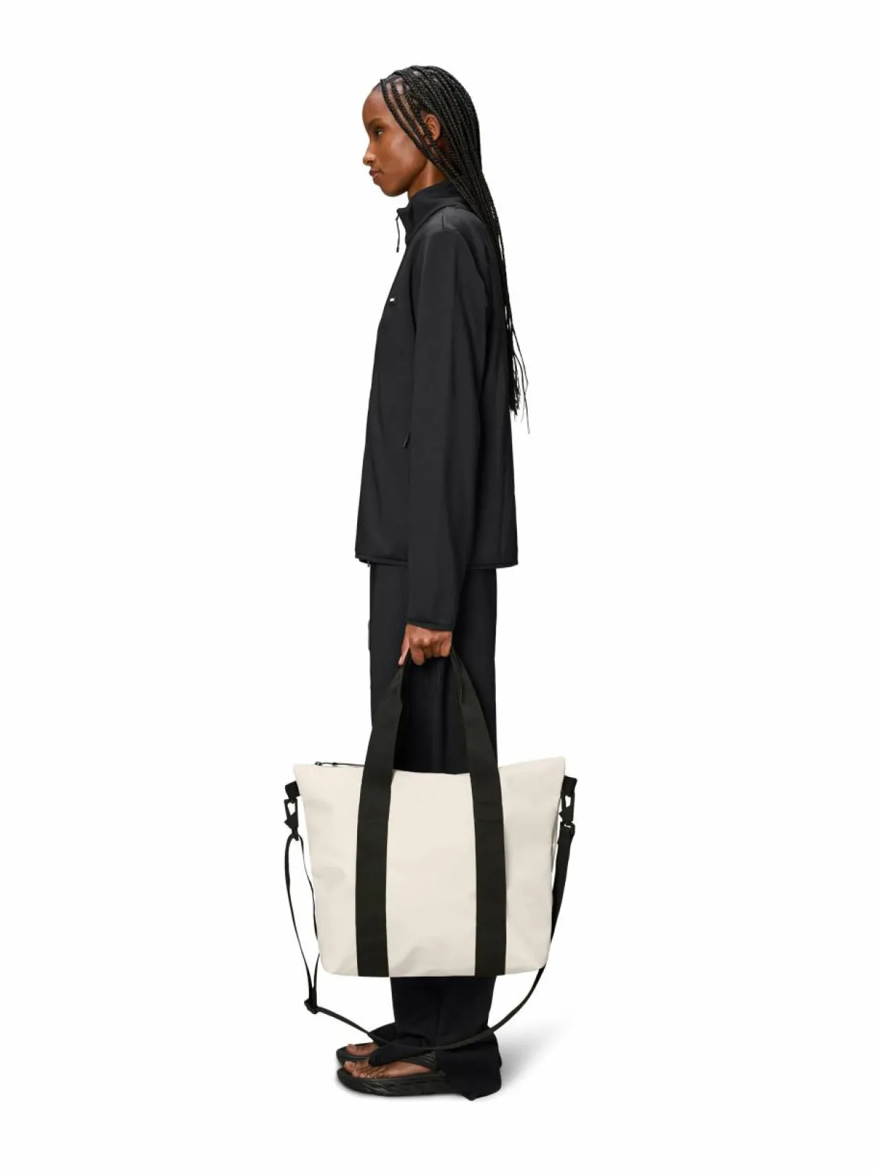 Kätevänkokoinen Tote Mini -laukku on vedenpitävä kantolaukku, joka sopii täydellisesti ostoksille, työmatkoille tai toimistoon. Suunnittelu on täynnä huomaamattomia toiminnallisia yksityiskohtia, jotka tuovat sille ensiluokkaisen ja käytännöllisen ilmeen. Täyspitkä päällystetty vetoketju ja tilava pääosasto sekä vetoketjutasku. Tote Mini -laukku tarjoaa erilaisia kantovaihtoehtoja irrotettavan olkahihnan ja pitkien kantokahvojen ansiosta. Kantokahvoissa on myös kiinnitysrenkaita pienille esineille, kuten avaimille. Laukku on valmistettu Rainsin vedenkestävästä PU-kankaasta, joka on suunniteltu kantamisen vahvuutta, kestävyyttä ja pehmeää tuntua ajatellen. Mitat: korkeus 36, leveys 35 cm, syvyys 13 cm.