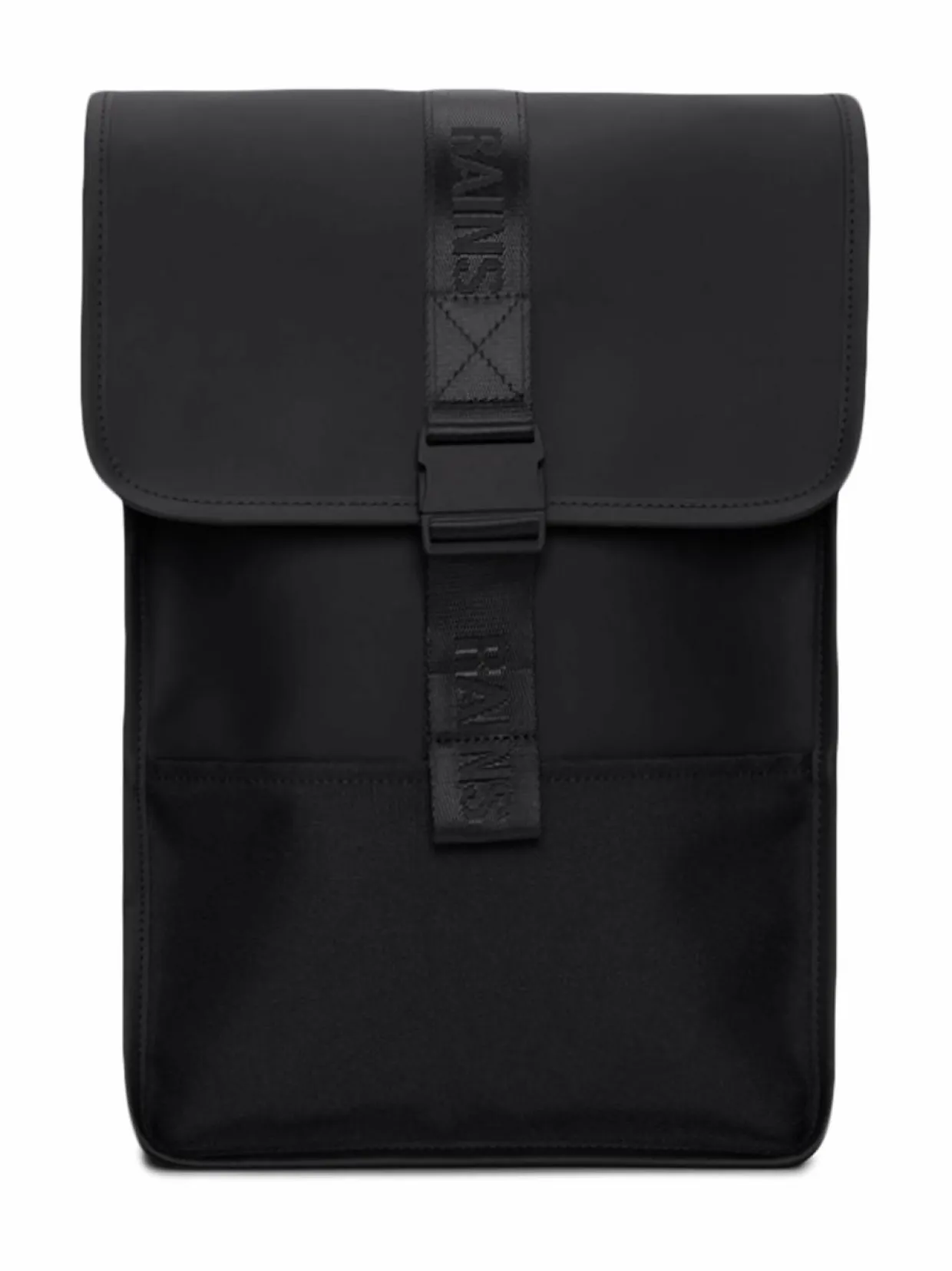 Trail Backpack Mini on pienempi versio Trail-reppumallista. Repussa on tyypillinen läppä ja keskikohdalla oleva hihna, jossa on Rains-merkin kumipäällysteinen solki. Urheilullisessa repussa on sisäinen kannettavan tietokoneen tasku 15 tuuman kannettava tietokonelle, tilava päälokero ja pehmustettu takapaneeli sekä pehmustetut säädettävät olkahihnat. Trail Backpack Mini on valmistettu Rainsin tunnusomaisesta vedenpitävästä PU-kankaasta, joka on suunniteltu kantokykyä, kestävyyttä ja pehmeää tuntumaa ajatellen. Paino on 0,81 kg. Repun vedenkestävyys on W3, mikä tarkoittaa, että se suojaa kevyeltä sateelta.