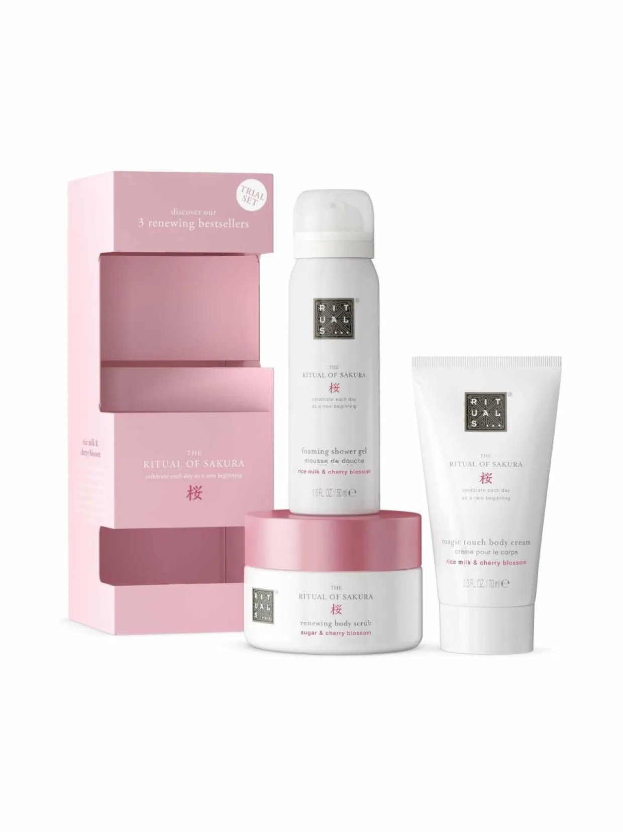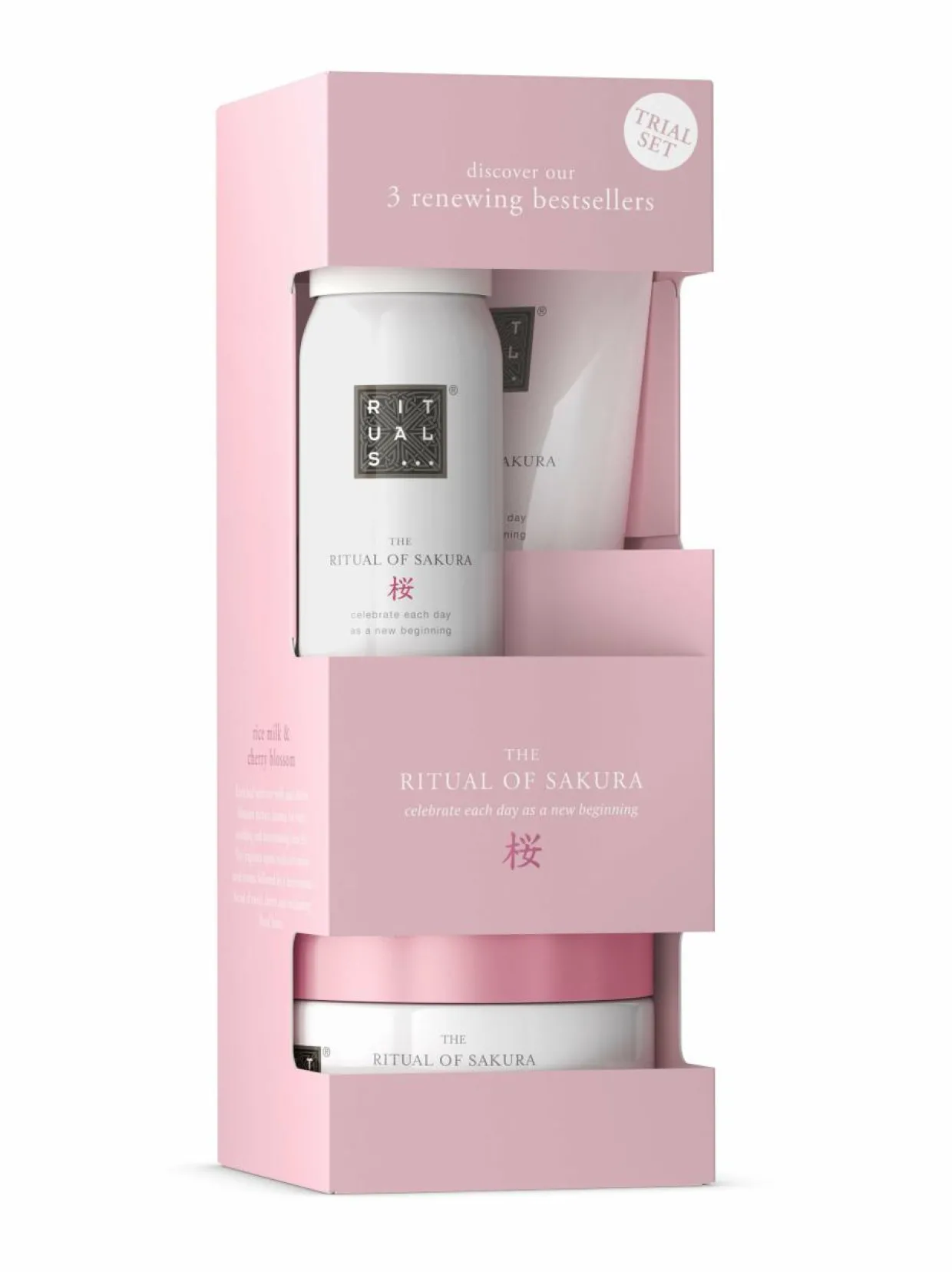 Ritual of Sakura -pakkaus sisältää kolme myydyintä tuotetta: vaahtoavan suihkugeelin, 92-prosenttisesti luonnollisen vartalovoiteen ja luonnollisen sokerivartalokuorinnan. Kaikkia sarjan tuotteita on rikastettu kirsikankukkauutteella ja ravitsevalla riisimaitouutteella, jotka symboloivat uutta alkua.
