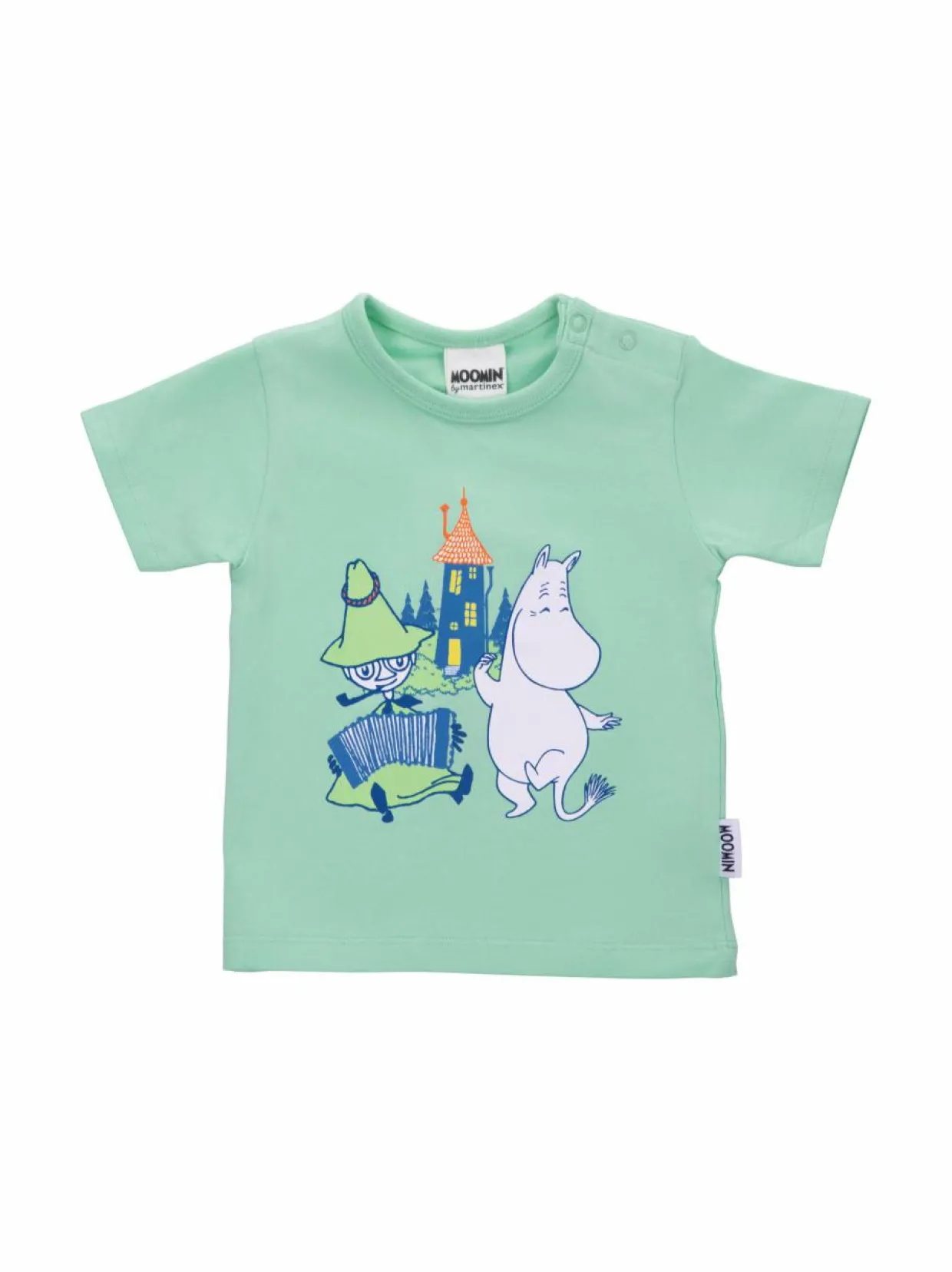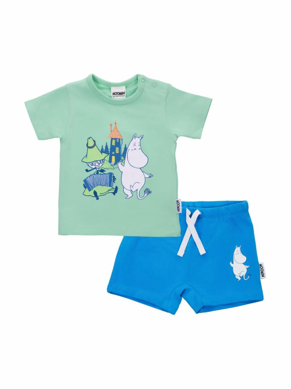 2-osainen shortsisetti perheen pienimmille. Mukava Muumi Trubaduuri -setti koostuu t-paidasta ja shortseista, joissa on joustava sekä säädettävä vyötärölinja. Paidan olkapäässä on nepparit helpottamassa sen pukemista ja riisumista. Materiaalina on käytetty pehmeän tuntuista ja joustavaa luomupuuvillatrikoota.