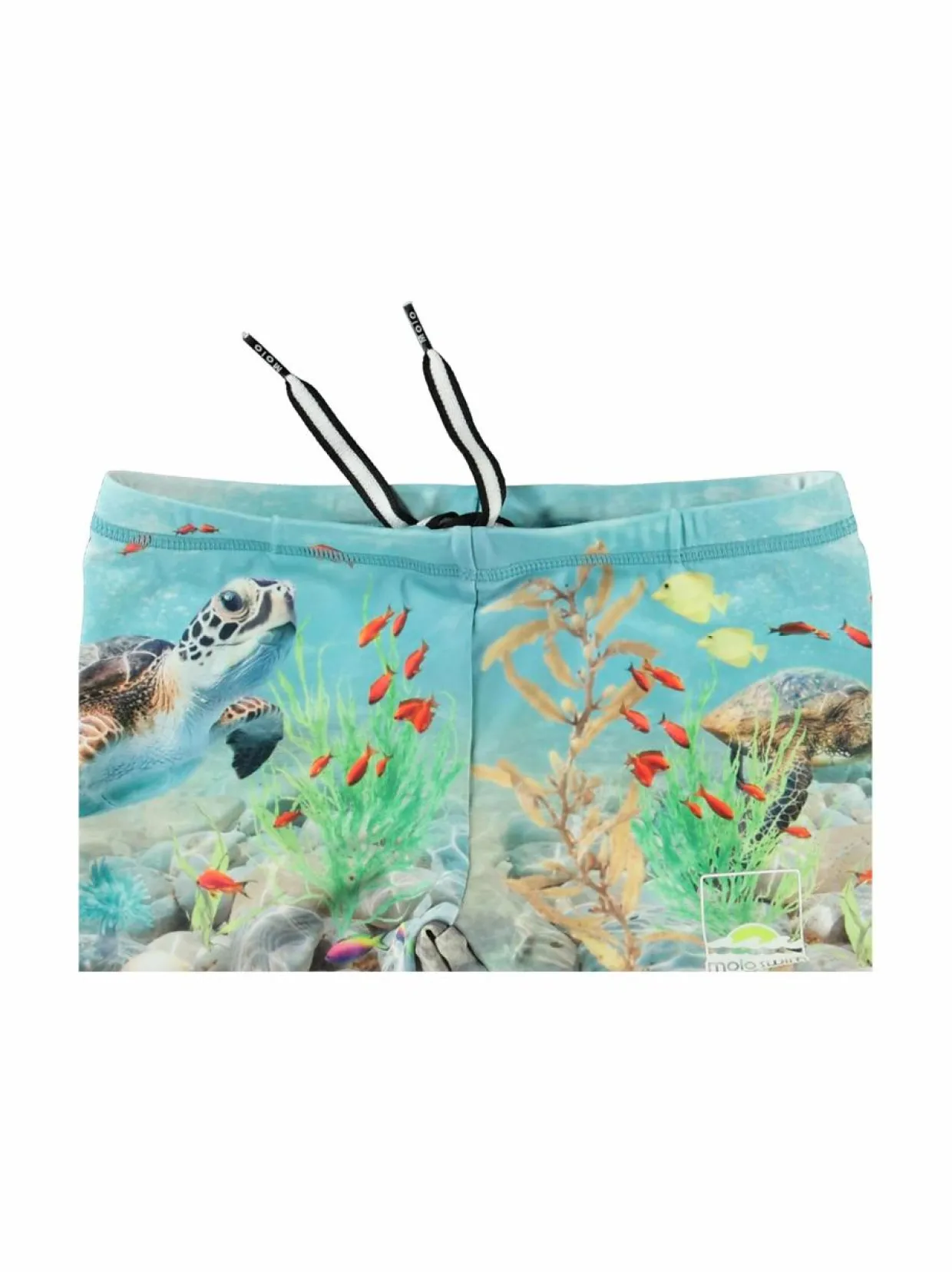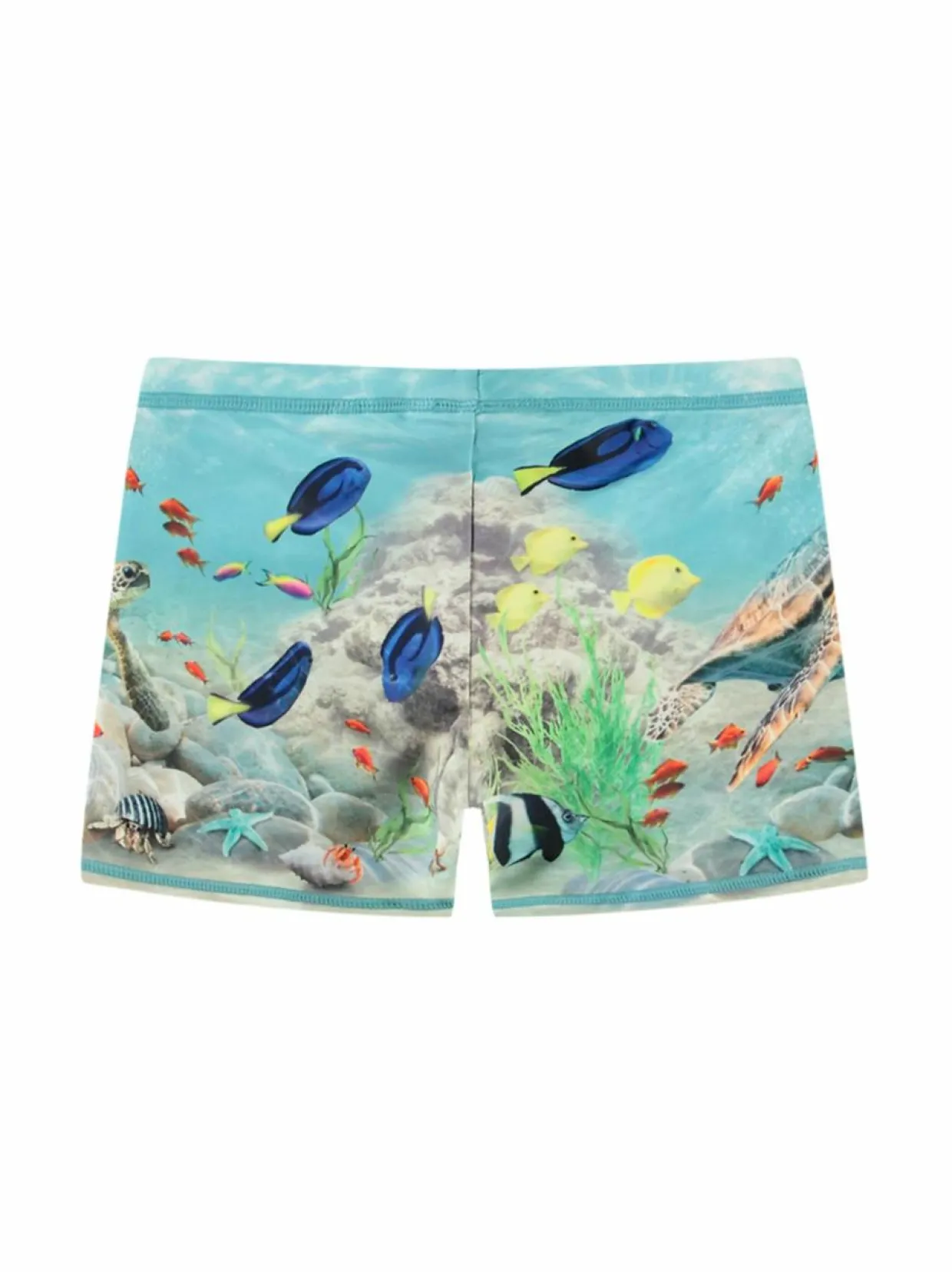 Molo-merkin Trunks-uimahousut on valmistettu nopeasti kuivuvasta ja kestävästä materiaalista. Uimahousuihin on painettu kauttaaltaan hieno meriaiheinen kuviointi ja niissä on säädettävä ja solmittava vyörärönauha. Uimahousut sopii täydellisesti uimiseen ja leikkimiseen vedessä. Polyesteri on kevyt ja hengittävä materiaali, joka kuivuu nopeasti. Elastaani lisää rakenteeseen joustavuutta ja käyttömukavuutta.