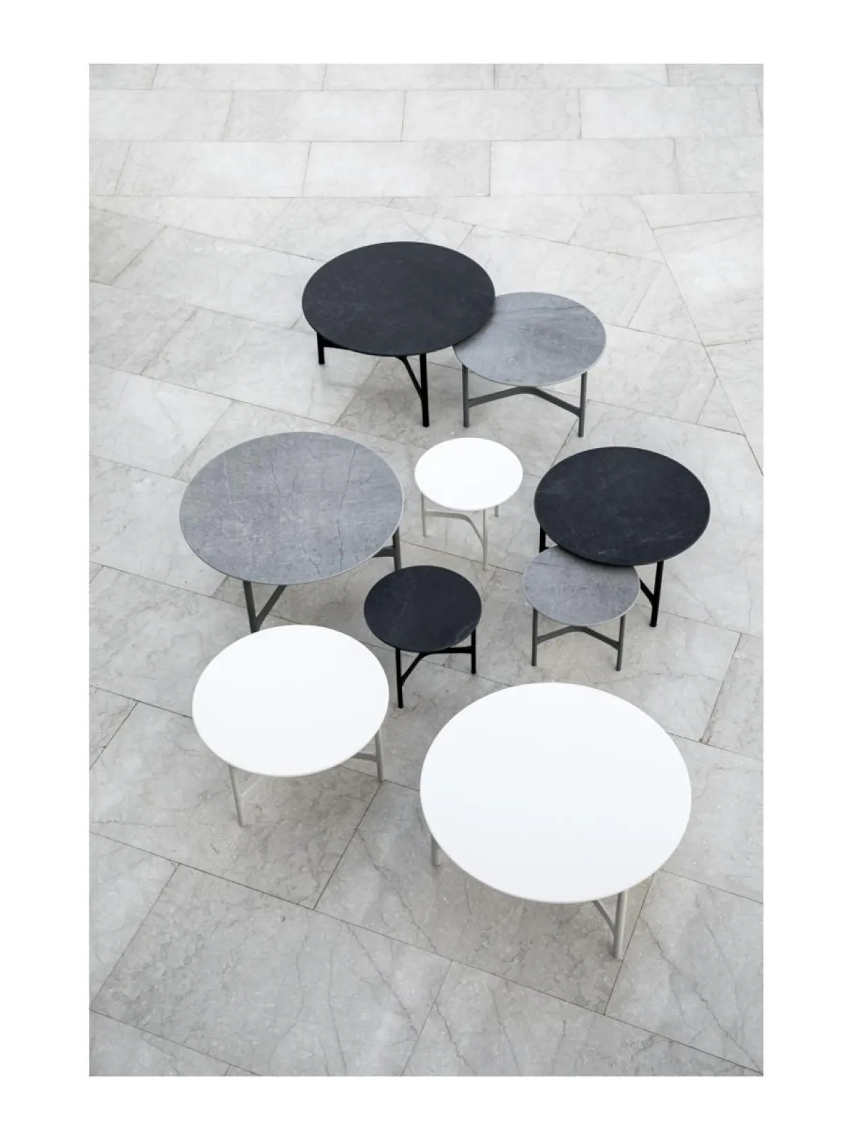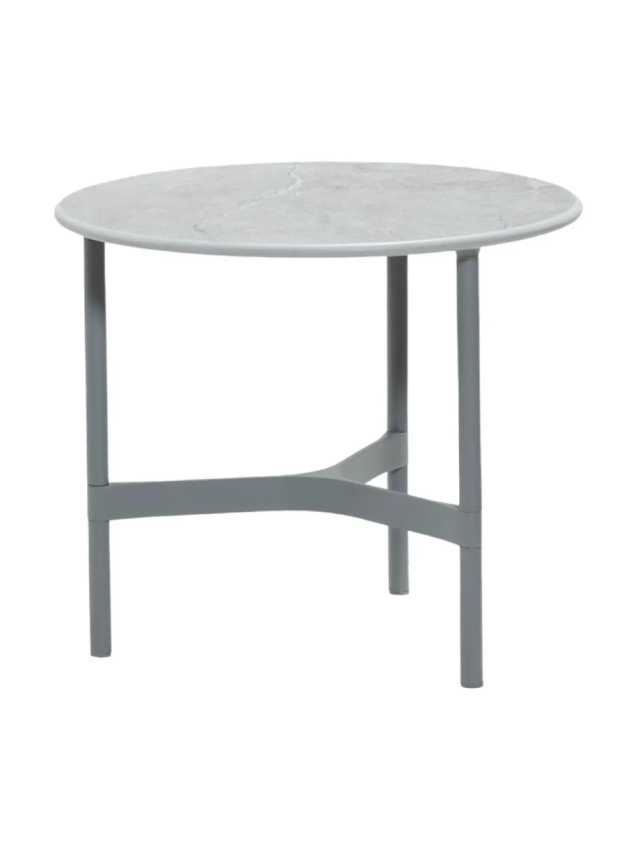 Twist -sohvapöytä ulkokäyttöön. 45 halk x 33 cm. Vaaleanharmaa jauhemaalattu alumiinirunko, keraaminen kansi, harmaa fossiilikuviointi. Helppohoitoinen. Toimii yksin tai muiden Twist-sarjan pikkupöytien kanssa yhdistettynä.
