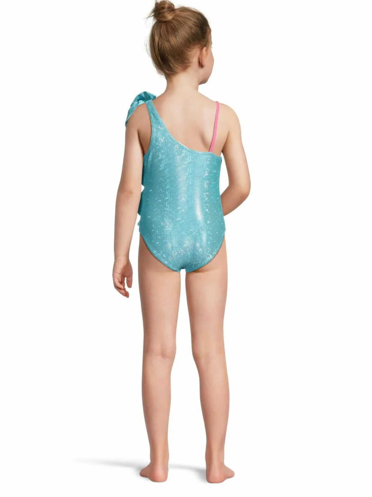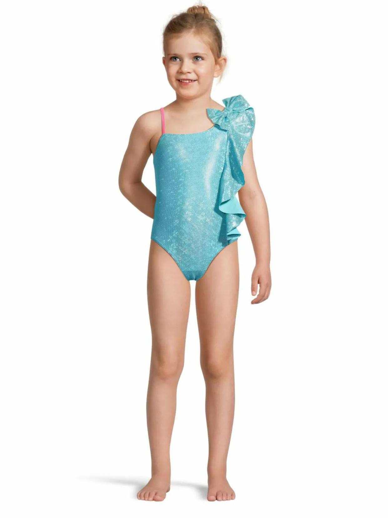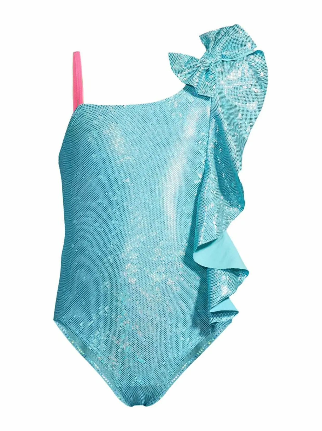 Kimaltava uimapuku, jossa on yhden olkaimen muotoilu sekä rusetti sekä röyhelöt sivussa. Joustava ja kestävä materiaali tarjoaa mukavuutta ja hyvän istuvuuden.