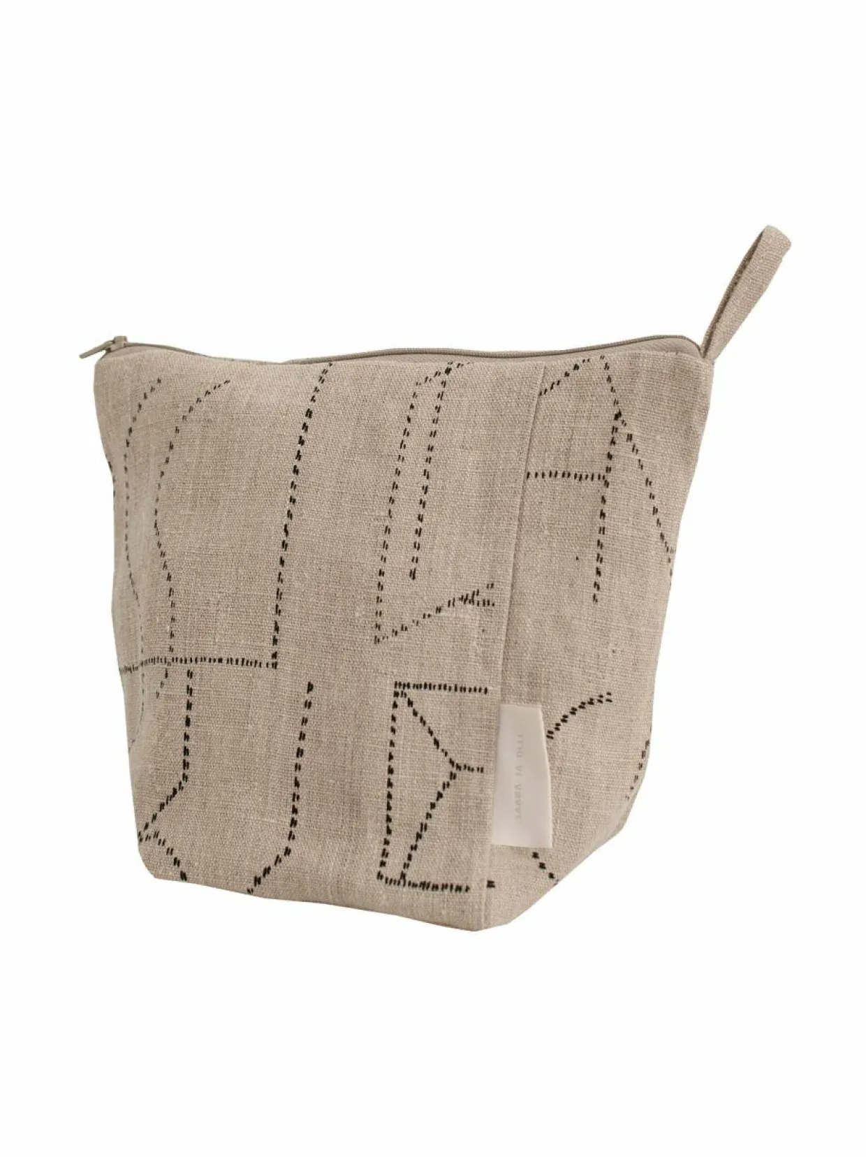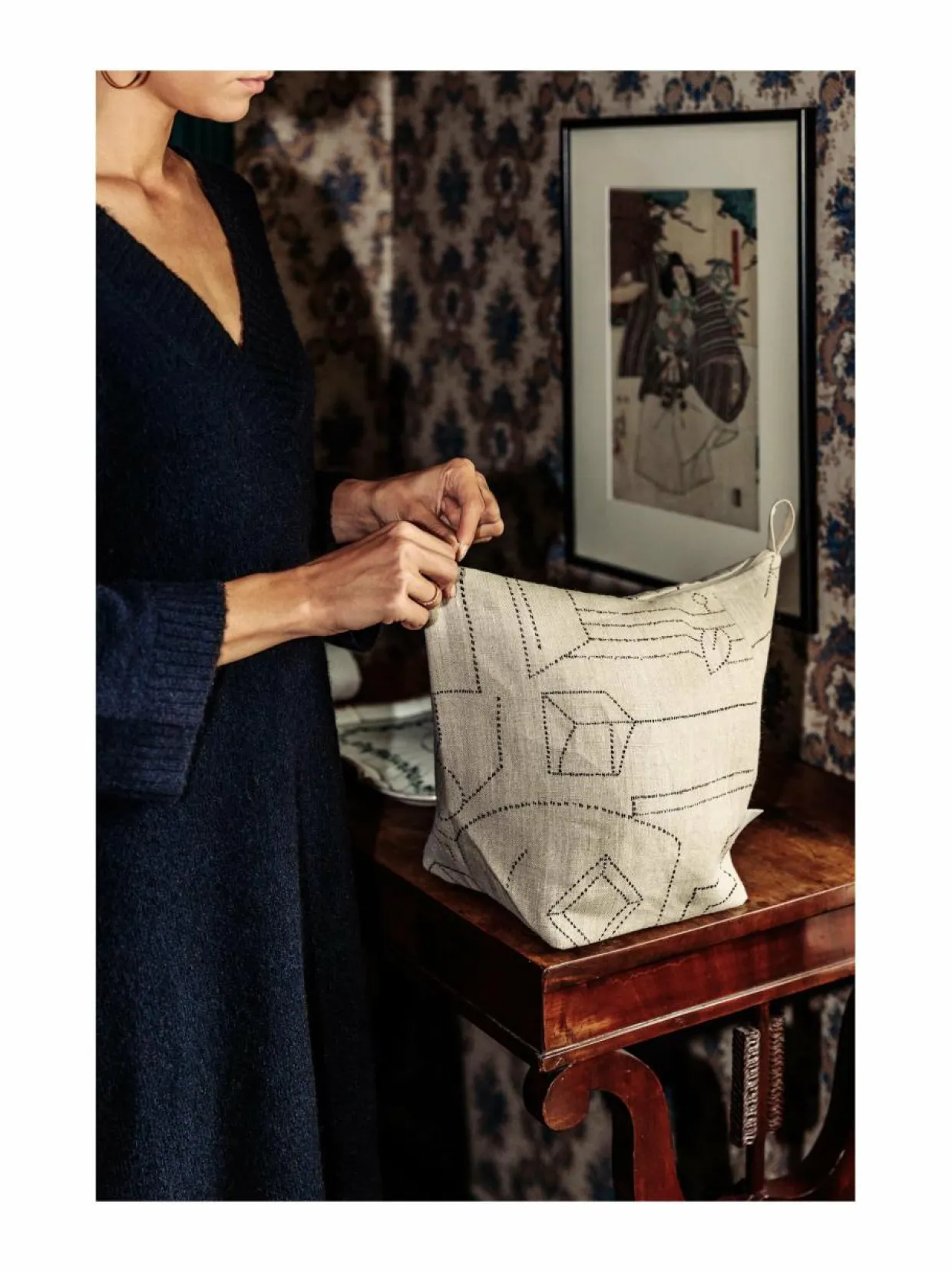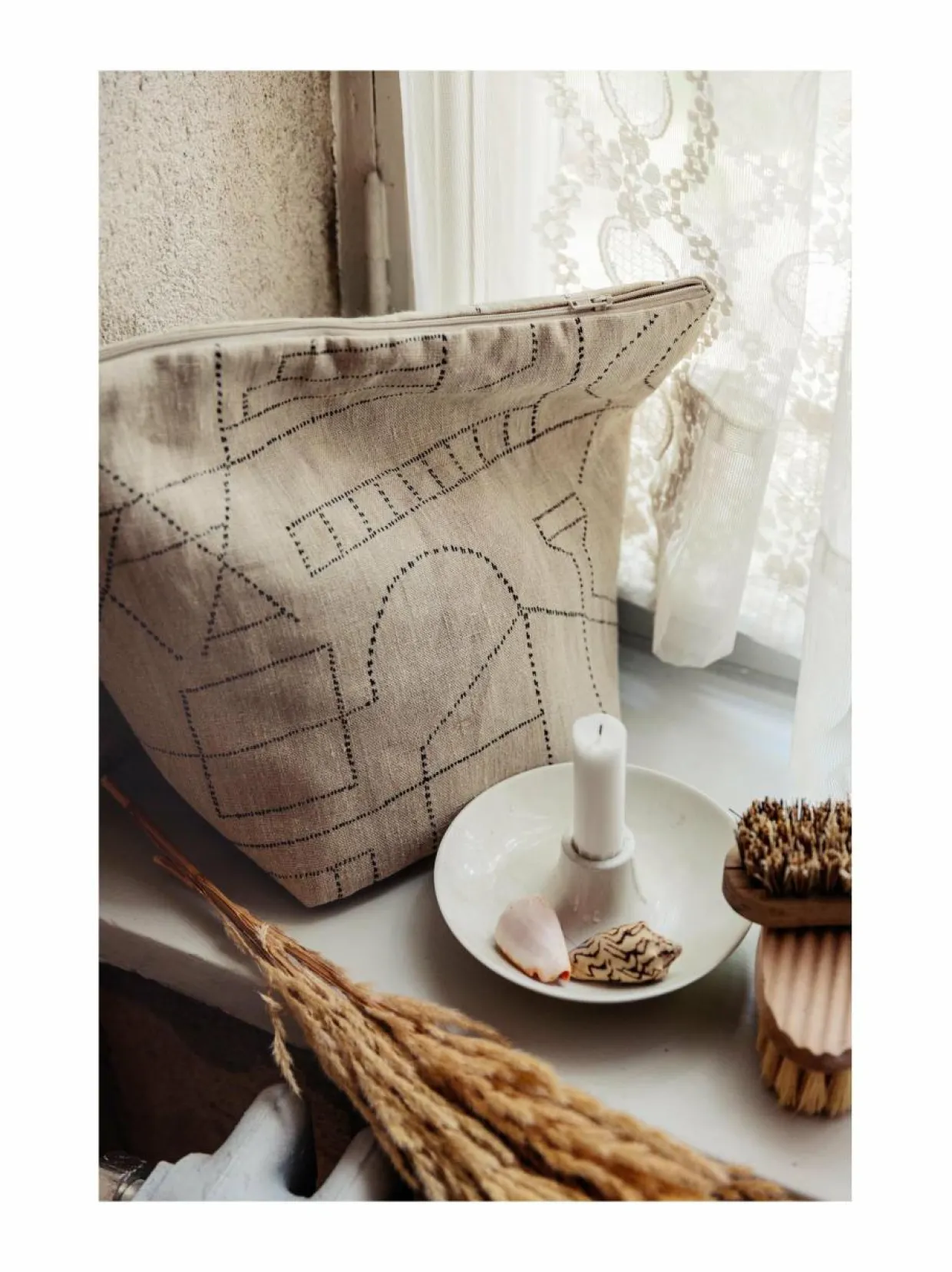 Saana ja Ollin Unien talo -kosmetiikkalaukun abstrakti kuosi on inspiroitunut rakennusperinteestä ja arkkitehtonisista unista.