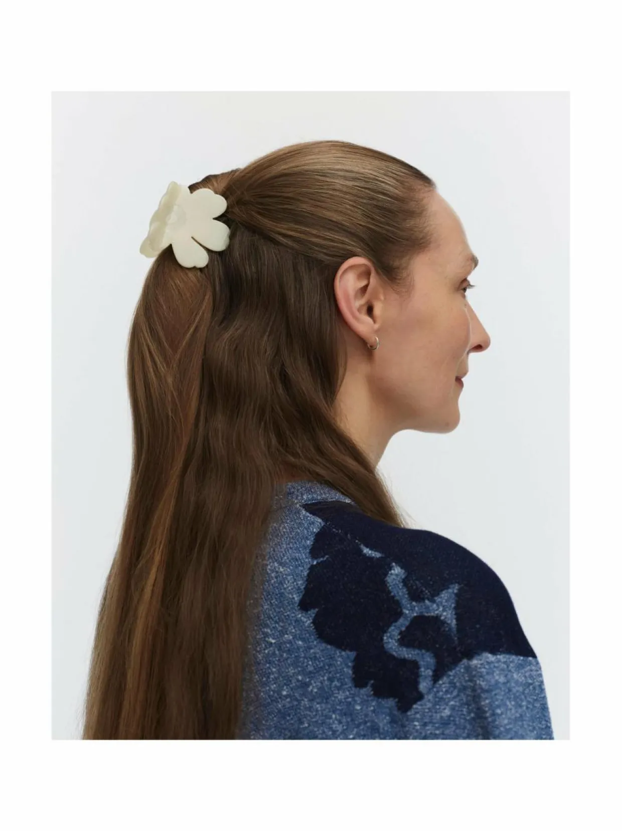 Pieni Unikko-kukan mallinen hiusklipsi on valmistettu akryylistä, josta 70 % on kierrätettyä. Klipsi on helppo kiinnittää hiuksiin ja se pysyy hyvin paikoillaan. Luovuutta ja rohkeutta symboloiva Unikko syntyi aikana, jolloin Marimekon kuviomaailmaan ei juuri kuulunut kukkia. Maija Isolaa kukka-aihe kuitenkin kiinnosti, ja hän päätti suunnitella kokonaisen sarjan uudenlaisia vahvoja kukkakuoseja.