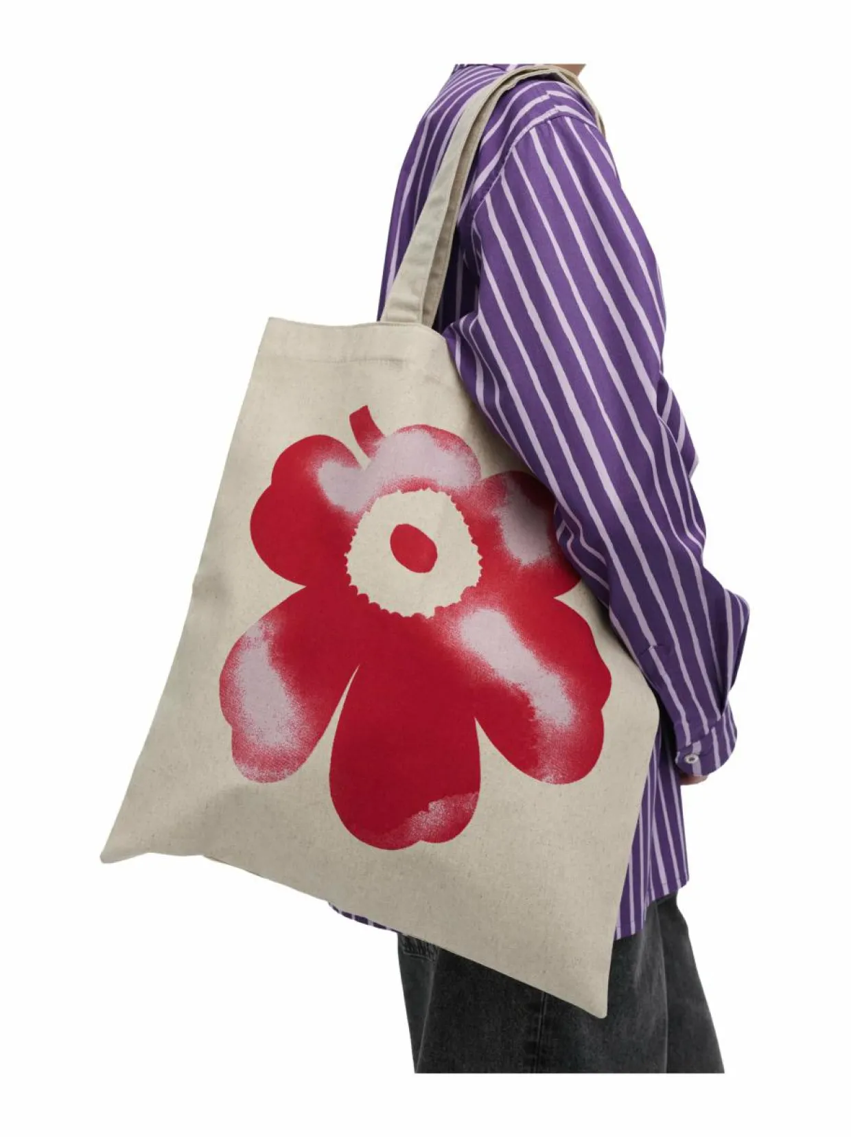 Vankka-kassi on valmistettu ryhdikkäästä puuvillapellavakankaasta ja siihen on painettu suuri Akvarelli Unikko -kuosin kukka, joka näyttää ikään kuin vesiväreillä maalatulta. Tämä shopper-laukku on tilava ja käytännöllinen valinta arkeen tai vapaa-aikaan. Laukun koko on 44 x 41 cm ja kantokahvan pituus on 54 cm.