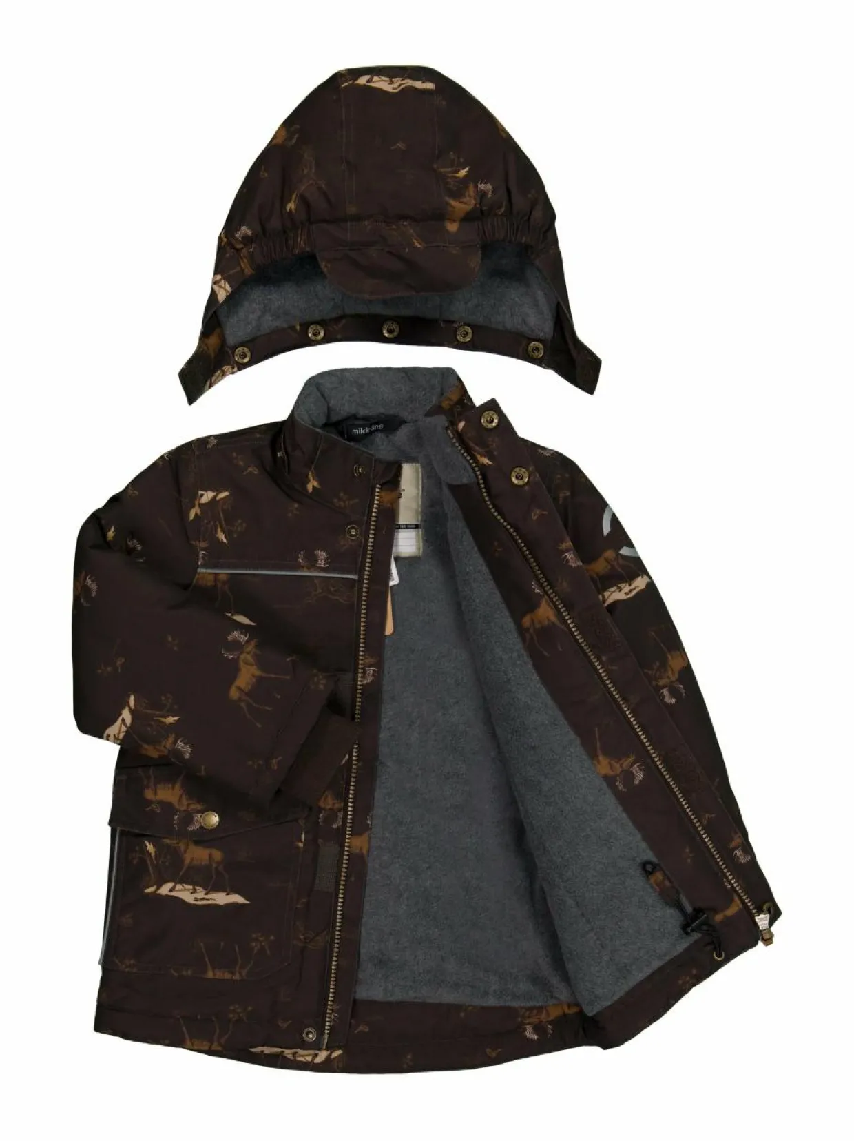 Mikk-line talvitakki talvisen metsän villieläinprintillä on valmistettu kierrätyspolyesteristä ja fluorittomalla BIONIC-FINISH® ECO -pinnoitteella. Takissa on pehmeä fleecevuori hupussa, rungossa ja kauluksessa. Hihoissa ja taskuissa on kitkaton taftivuori, värjätty Solution Dye -menetelmällä. Takki pitää lapsen lämpimänä, kuivana ja mukavana märällä, tuulisella ja lumisella säällä.