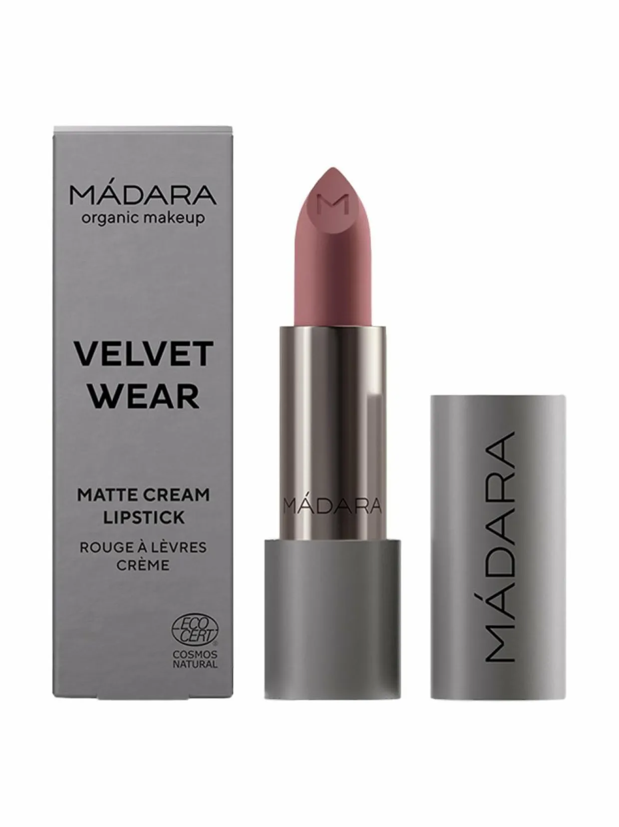 Tämä Velvet Wear Cream -huulipuna Mádaralta on 100 % vegaania, sertifoitua luonnonkosmetiikkaa.