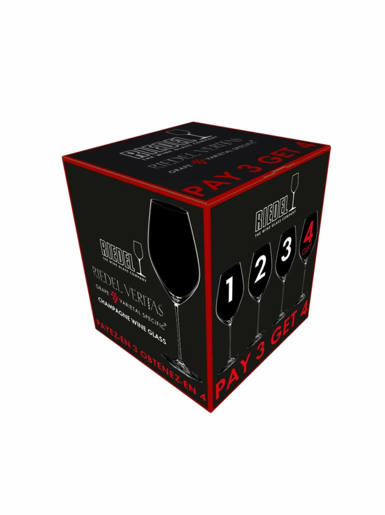 Pyöristetty samppanjalasi tuo samppanjan moniulotteisen makumaailman esille paremmin kuin kapea lasi. Riedelin Veritas-sarjan viinilasit ovat hienostuneen kevyttä, mutta kestävää kristallilasia. Pakkauksessa on 4 samppanjalasia.