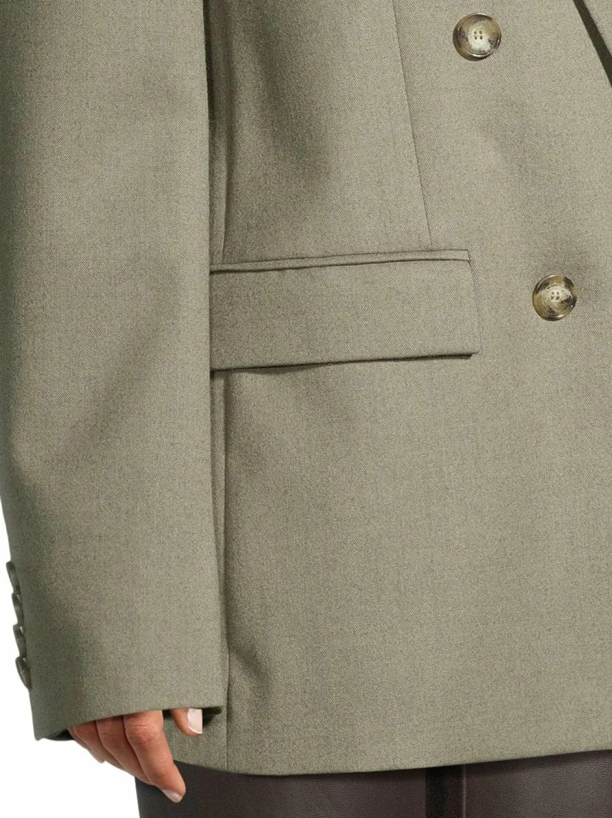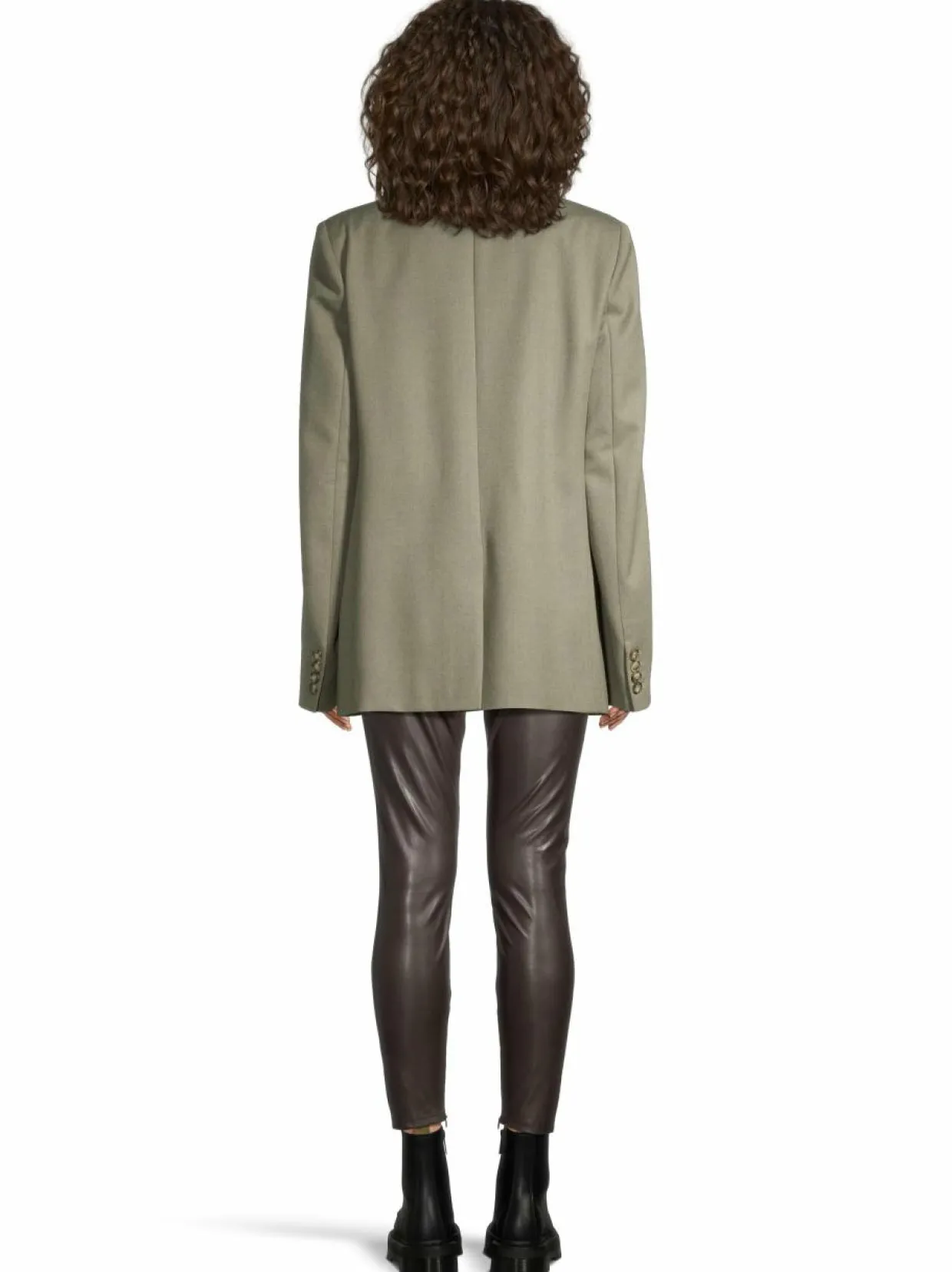 Stella McCartneyn villakankainen flanellibleiseri kiinnitetään kaksirivisellä napituksella. Ryhdikkäässä bleiserissä on on näyttävä kaulus, kaksi läpällistä käsitaskua ja yksi rintatasku. Takahelmassa on keskellä halkio.