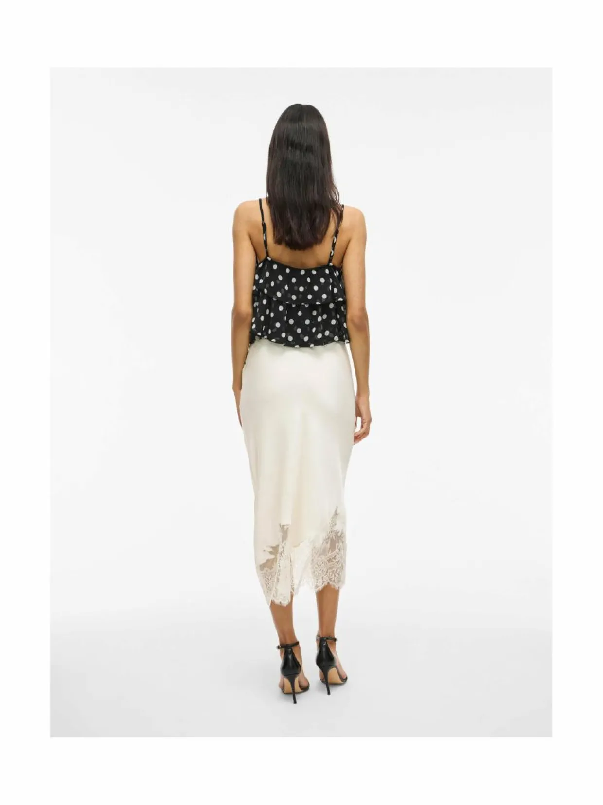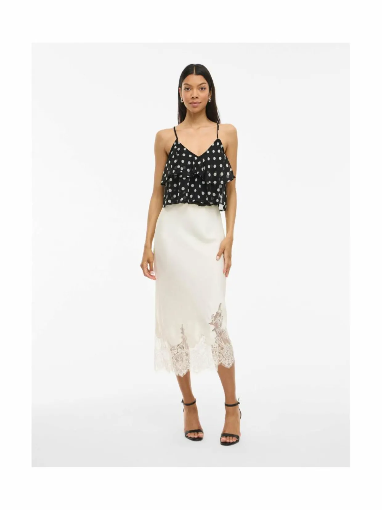 Vilan Visabel Lace Detail -midihameen helmaa koristaa kaunis pitsireuna. Hame on hohtavaa polyesteriä, joka laskeutuu kauniisti ja on helppohoitoinen. Se sopii sekä arkeen että juhlaan.