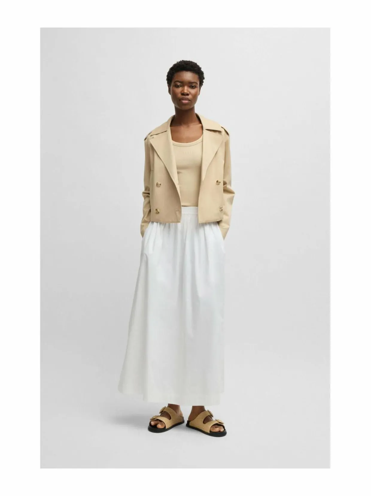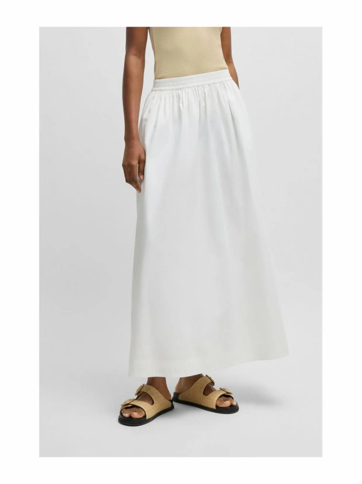 BOSS vaatemerkin Vlondie-hame on valmistettu pehmeästä popliinikankaasta, joka tuntuu miellyttävältä ihoa vasten. Sen muotoilu on rennon ilmava, sopien monenlaisiin tilaisuuksiin. Hameessa on joustava vyötärö, joka tarjoaa mukavan istuvuuden sekä käytännölliset sivutaskut.
