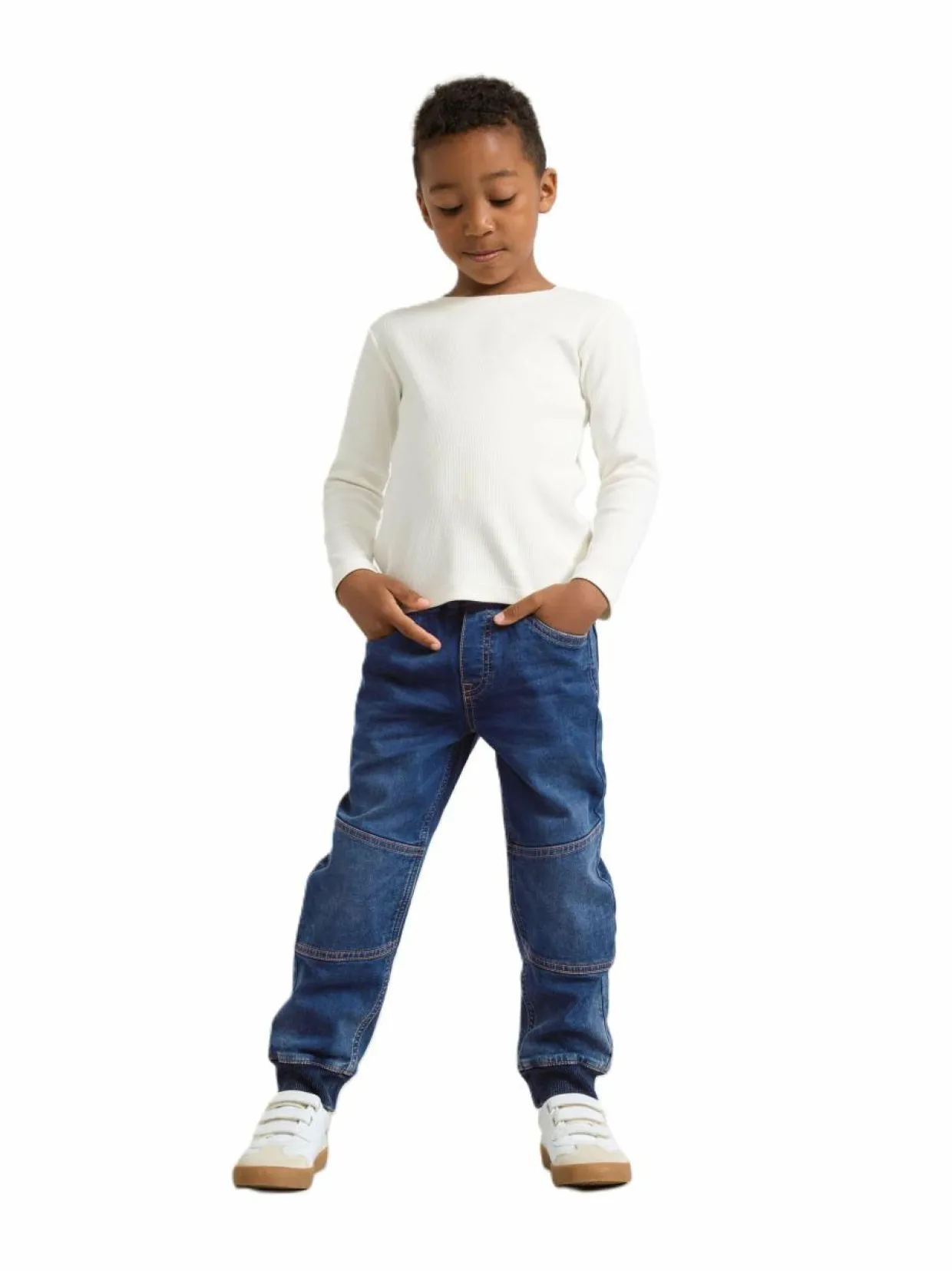 Mukavat ja joustavat pull-up-farkut on valmistettu pehmeästä denimjerseystä. Farkuissa on väljä istuvuus, kapenevat lahkeet, joustava vyötärö ja resorit lahkeensuussa. Polvet on vahvistettu kaksikerroksisella kankaalla.