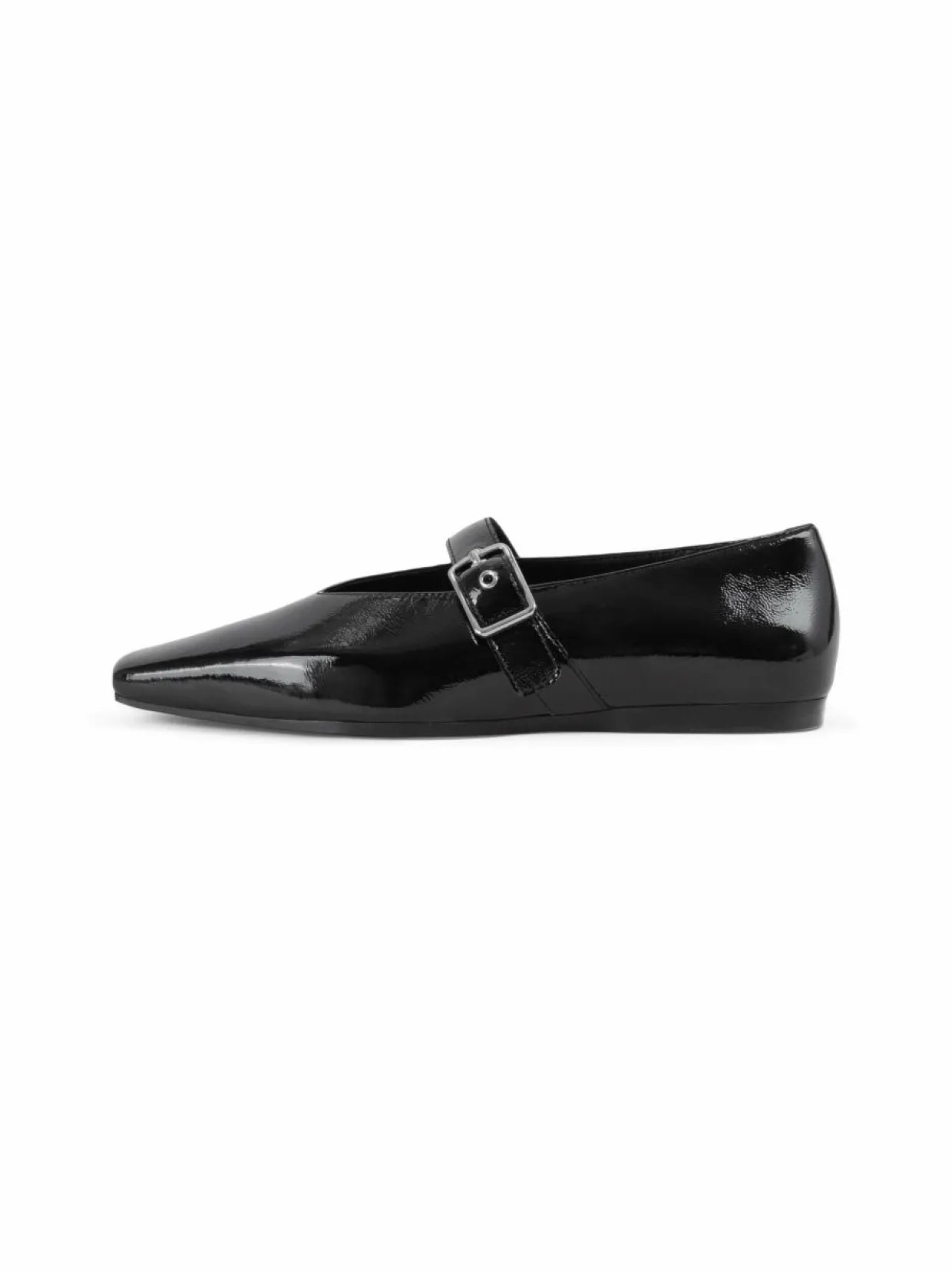 Vagabondin Mary Jane -tyyliset Wioletta-kengät on valmistettu kiiltävästä nahasta. Kengissä on terävät kärjet ja säädettävä nilkkaremmi hopeanvärisellä soljella. Matalat korot ovat 11 mm. Tyylin yksityiskohtiin kuuluvat myös nahkavuori ja nahkapohjalliset.