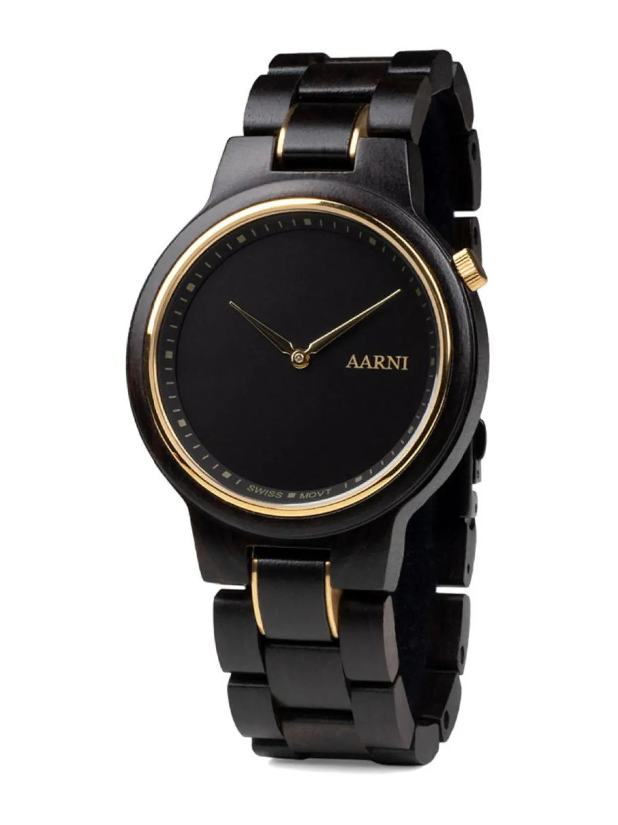 Mystiikkaa ja klassista kauneutta. Eebenpuusta valmistettu Aarni XO yhdistää pyöreän kellotaulun kultaisiin yksityiskohtiin. Upea kello lumoaa kantajansa ja kääntää katseet sekä miesten että naisten ranteissa. Kellon sydämenä toimii tarkka ja laadukas sveitsiläinen Ronda-koneisto.