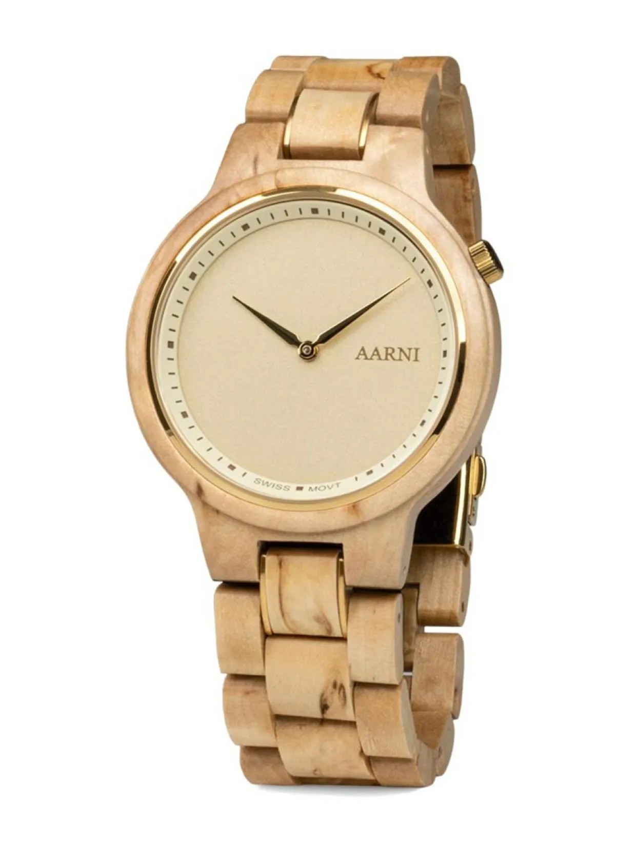 Suomalaisesta visakoivusta valmistettu Aarni XO on elegantti rannekello Sinulle, joka etsit ainutlaatuista kelloa. Kultaiset yksityiskohdat yhdistettynä ohueen koteloon tekevät tästä mallista todellisen katseenvangitsijan, joka sopii erinomaisesti sekä miesten että naisten ranteeseen. Kellon sydämenä toimii tarkka ja laadukas sveitsiläinen Ronda-koneisto.