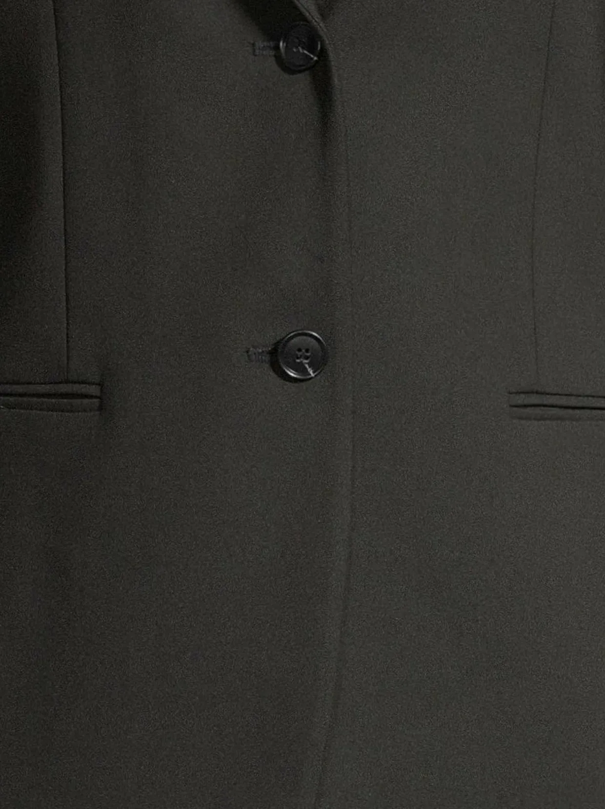 Minimalistinen bleiseri päivittäiseen käyttöön. Kapeammin mitoitettu vartalonmyötäinen bleiseri on joustavaa luomupuuvilla-polyesteriä. yksityiskohtana käännekaulus, yksirivinen napitus ja listataskut.