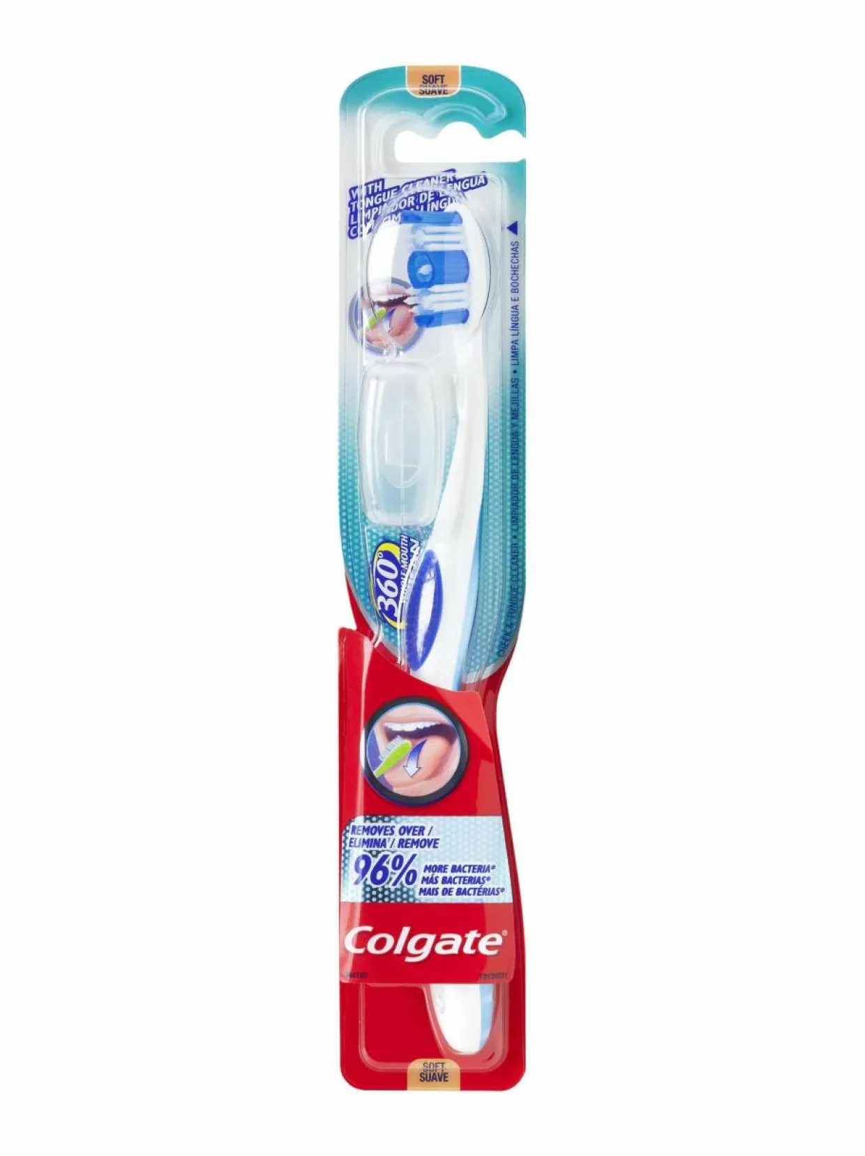 Colgate 360° Soft -hammasharja puhdistaa tehokkaasti, mutta hellävaraisesti koko suun. Siinä on kielen -ja poskien sisäpintojen puhdistaja, hammasväleihin yltävät harjakset sekä kiillottava kuminen harjasosan ydin.
