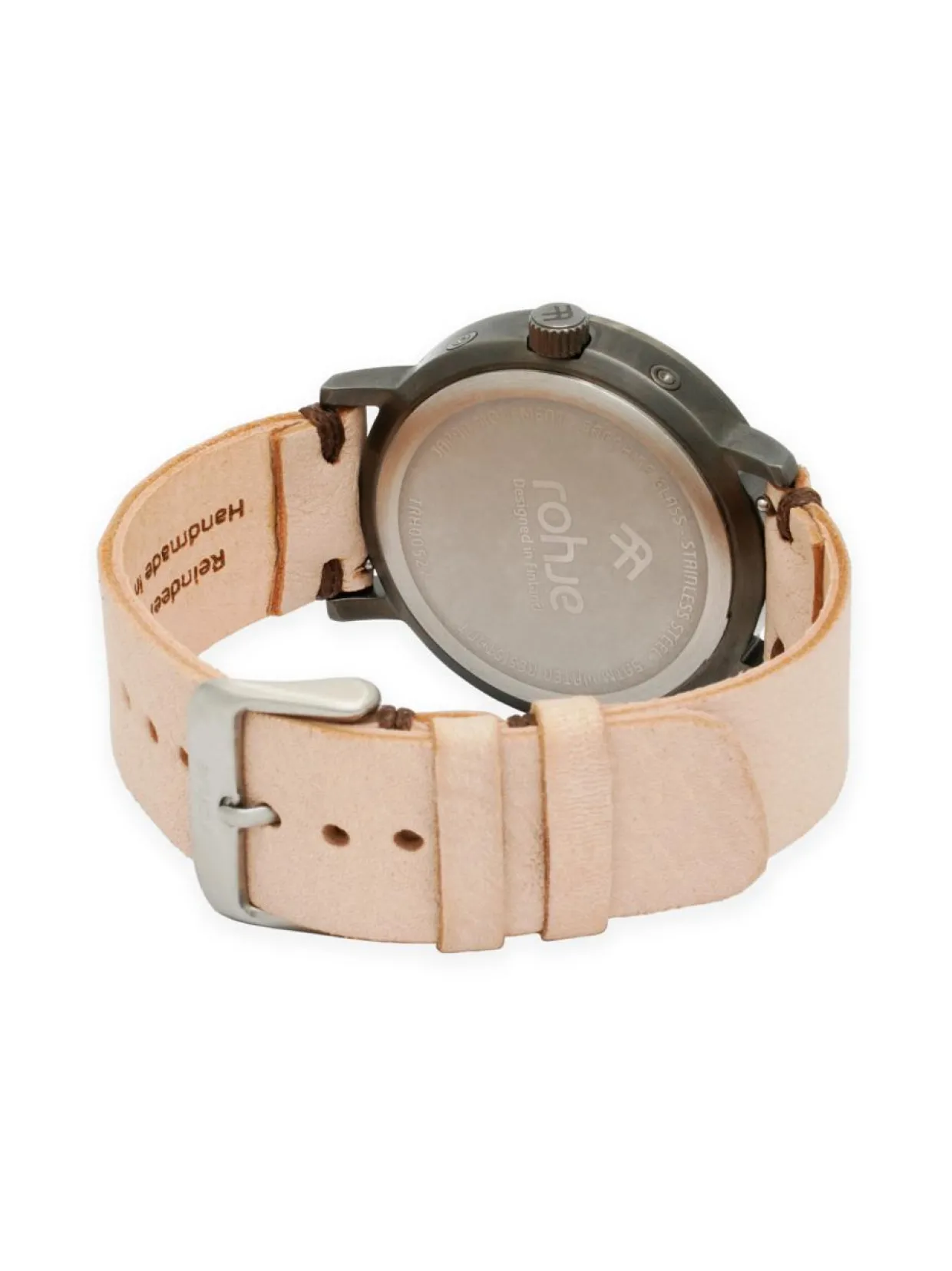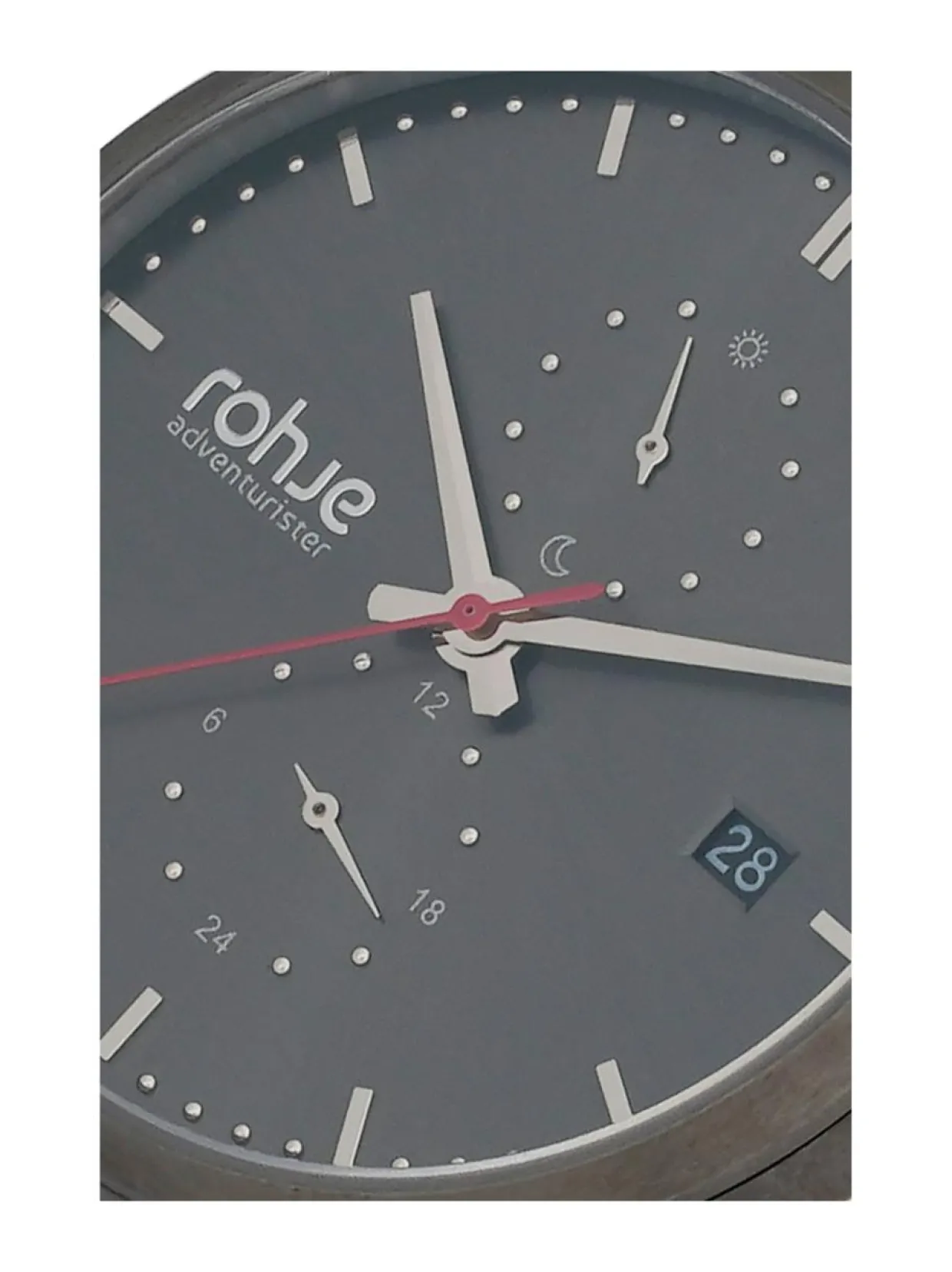 Rohje-rannekello on suomalaista muotoilua. Hillityn ulkoasunsa ansiosta Rohje Adventurister Dark poronnahkaisella rannekkeella sopii tilanteeseen kuin tilanteeseen aina luonnosta urbaaniin ympäristöön, juhlaan sekä arkeen. Poronnahkaranneke on suomalaista käsityötä. Sopivan kokoisen runkonsa ansiosta (halkaisija: 40 mm ja kellon paksuus vain 8,2 mm) kello on tehty seikkailuihin. Runko on harjattua ruostumatonta kirurginterästä (316L) ja kellon safiirilasi kestää kovemmatkin seikkailut. Kevyen painon, kestävien materiaalien, vedenkestävyyden (5 ATM) ja kaksoisaika-toiminnallisuuden ansiosta se on luottoasuste.
