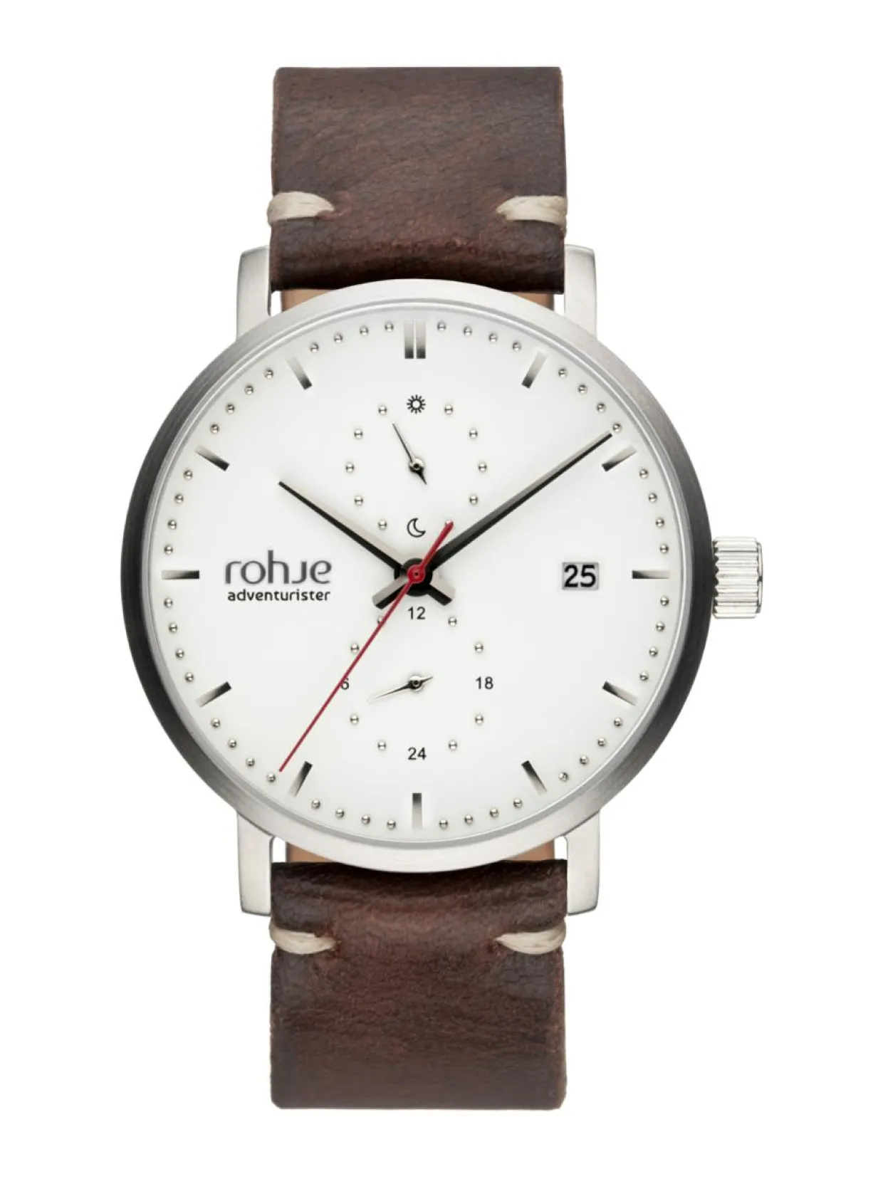 Rohje-rannekello on suomalaista muotoilua. Hillityn ulkoasunsa ansiosta Rohje Adventurister White poronnahkaisella rannekkeella sopii tilanteeseen kuin tilanteeseen aina luonnosta urbaaniin ympäristöön, juhlaan ja arkeen. Poronnahkaranneke on suomalaista käsityötä. Sopivan kokoisen runkonsa ansiosta (halkaisija: 40 mm ja kellon paksuus vain 8,2 mm) kello on tehty seikkailuihin. Runko on harjattua ruostumatonta kirurginterästä (316L) ja kellon safiirilasi kestää kovemmatkin seikkailut. Kevyen painon, kestävien materiaalien, vedenkestävyyden (5 ATM) ja kaksoisaika-toiminnallisuuden ansiosta se on luottoasuste.