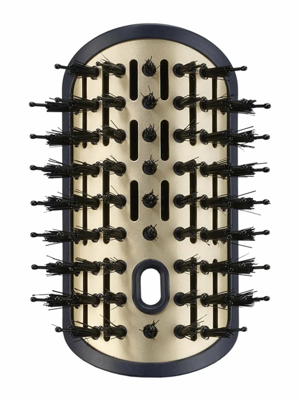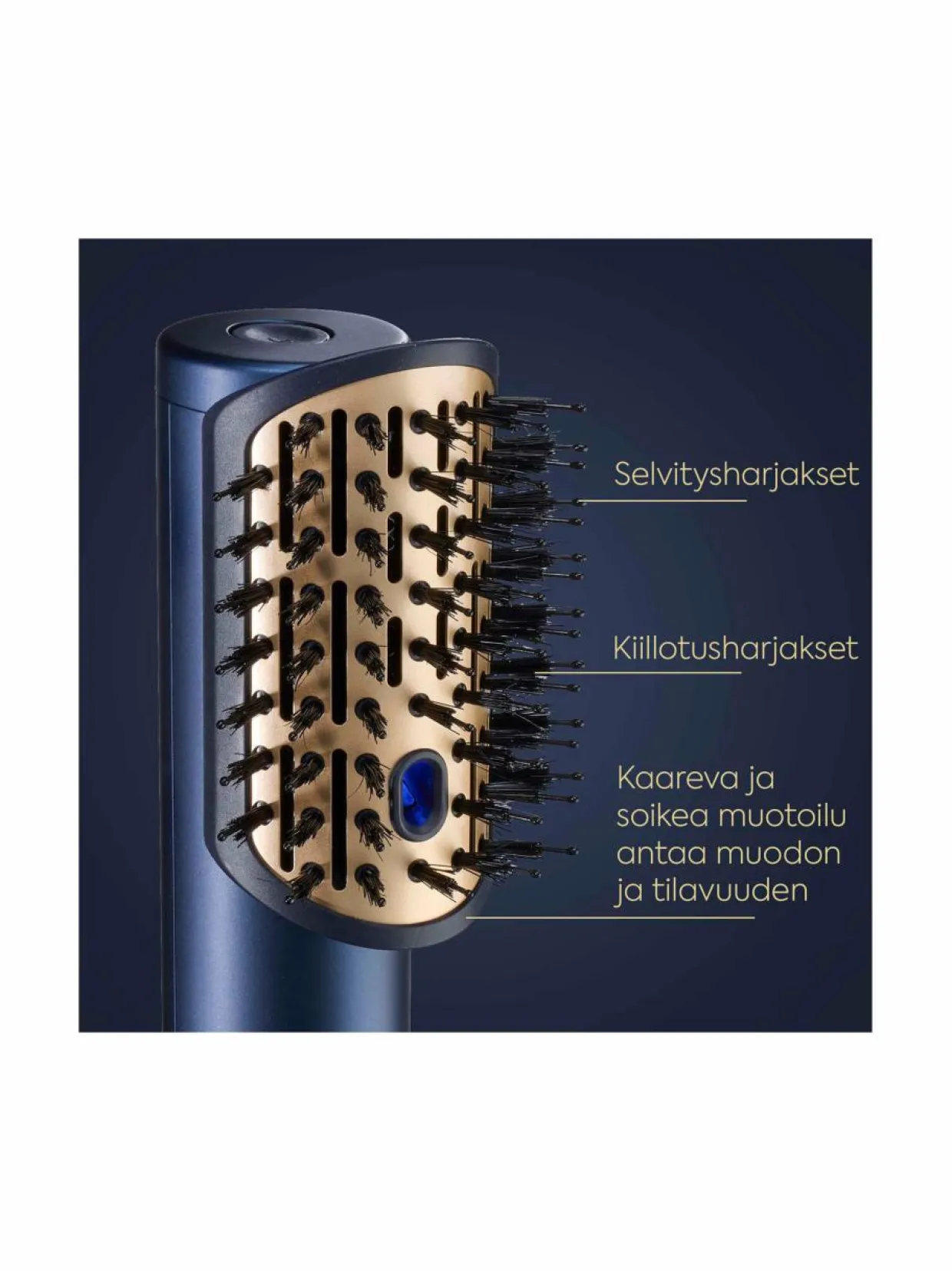 Kaareva ja soikea harja, jossa on täydellinen yhdistelmä hiuksia selvittäviä ja kiiltoa antavia harjaksia, jotka silottavat, tuuheuttavat ja varmistavat vaivattoman lopputuloksen.