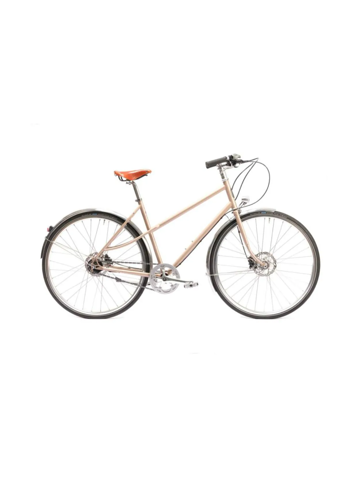 Kirkkaat napadynamovalot syttyvät automaattisesti liikkeelle lähdettäessä ja pysyvät päällä lyhyiden pysähdysten ajan. Shimano Alfine 8 -napavaihteet ja tehokkaat hydrauliset levyjarrut tekevät kaupunkiajosta vaivatonta ja turvallista. Pistosuojatut Schwalbe Spicer -renkaat rullaavat kevyesti. Siro tuplaohennetusta Cro-Moly-teräksestä valmistettu runko on kevyt ja ajotuntumaltaan vakaa. Pyörän kokoonpano on viimeistelty perinteikkäällä Brooksin nahkasatulalla.