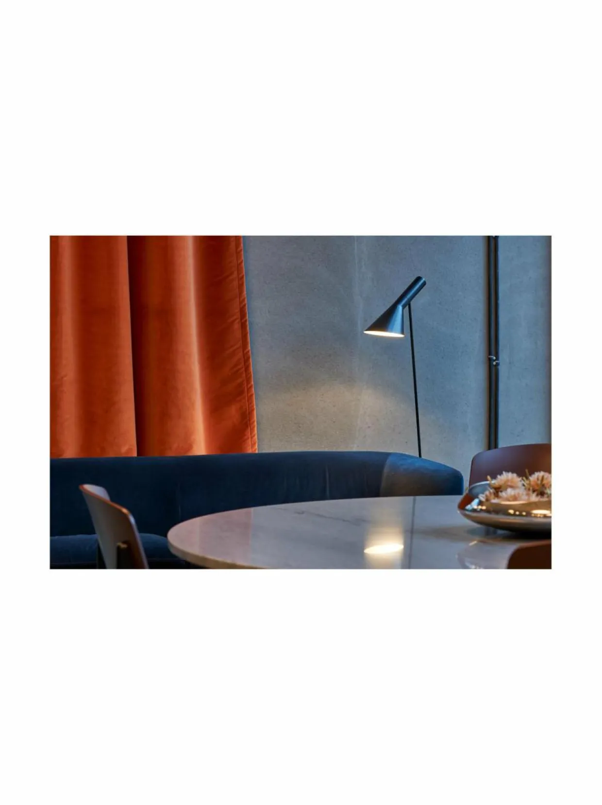 Arne Jacobsen suunnitteli yksinkertaisen tyylikkään AJ-valaisimen vuonna 1960 Kööpenhaminan Radisson SAS royal -hotelliin. Ajattoman muotokielensä ansiosta valaisin sopii hyvin monenlaiseen ympäristöön. Kallistuva varjostin voidaan säätää haluttuun asentoon ja kohdistaa valo juuri sinne, missä sitä tarvitaan. Valonlähde E27, 60W, A60. Korkeus on 130 cm, varjostimen pituus 32,5 cm, jalustan halkaisija 27,5 cm ja johdon pituus 2,6 m.