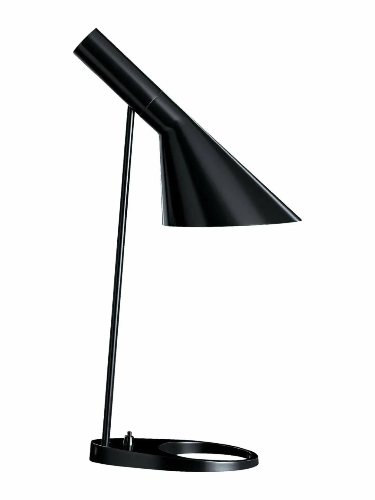 Arne Jacobsen suunnitteli yksinkertaisen tyylikkään AJ-valaisimen vuonna 1960 Kööpenhaminan Radisson SAS Royal -hotelliin. Ajattoman muotokielensä ansiosta valaisin sopii hyvin monenlaiseen ympäristöön. Kallistuva varjostin voidaan säätää haluttuun asentoon ja kohdistaa valo juuri sinne, missä sitä tarvitaan. Valonlähde E27, 60W. Korkeus on 56 cm, varjostimen pituus 35 cm, jalustan halkaisija 21,5 cm ja johdon pituus 2,4 m.