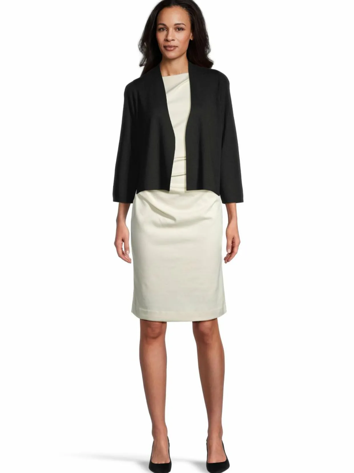 Lyhyt, edestä avattu neuletakki Essentials by Stockmannilta. Vaate on suunniteltu normaaliin istuvuuteen. Siinä on 3/4-pituiset hihat. Pehmeästä materiaaliyhdistelmästä löytyy esimerkiksi silkkimäinen viskoosi ja hengittävä pellava. Yksinkertaisen muotoilunsa ansiosta on neuletakkia helppo yhdistää erilaisiin asukokonaisuuksiin.