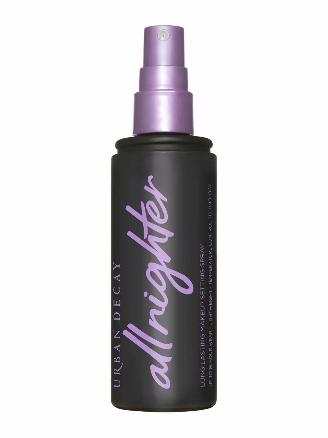 Urban Decay All Nighter Setting Spray on meikin viimeistelysuihke, joka antaa meikillesi uskomatonta pysyvyyttä. Viimeistelysuihke pitää meikkisi virheettömänä jopa 16 tuntia – meikki ei valu, lohkeile, haalistu tai kasaudu pieniin juonteisiin. All Nighter viilentää meikkisi pintaa ja koostumus on niin hienoa, että hädin tuskin tunnet sitä edes ihollasi! Viimeistelysuihke pitää meikkivoiteesi, luomivärisi, poskipunasi ja peitevoiteesi paikoillaan, jopa kuumissa tai kosteissa olosuhteissa. Lopputulos? Pehmeämmältä näyttävä iho sekä eloisa meikki, joka kestää koko päivän.