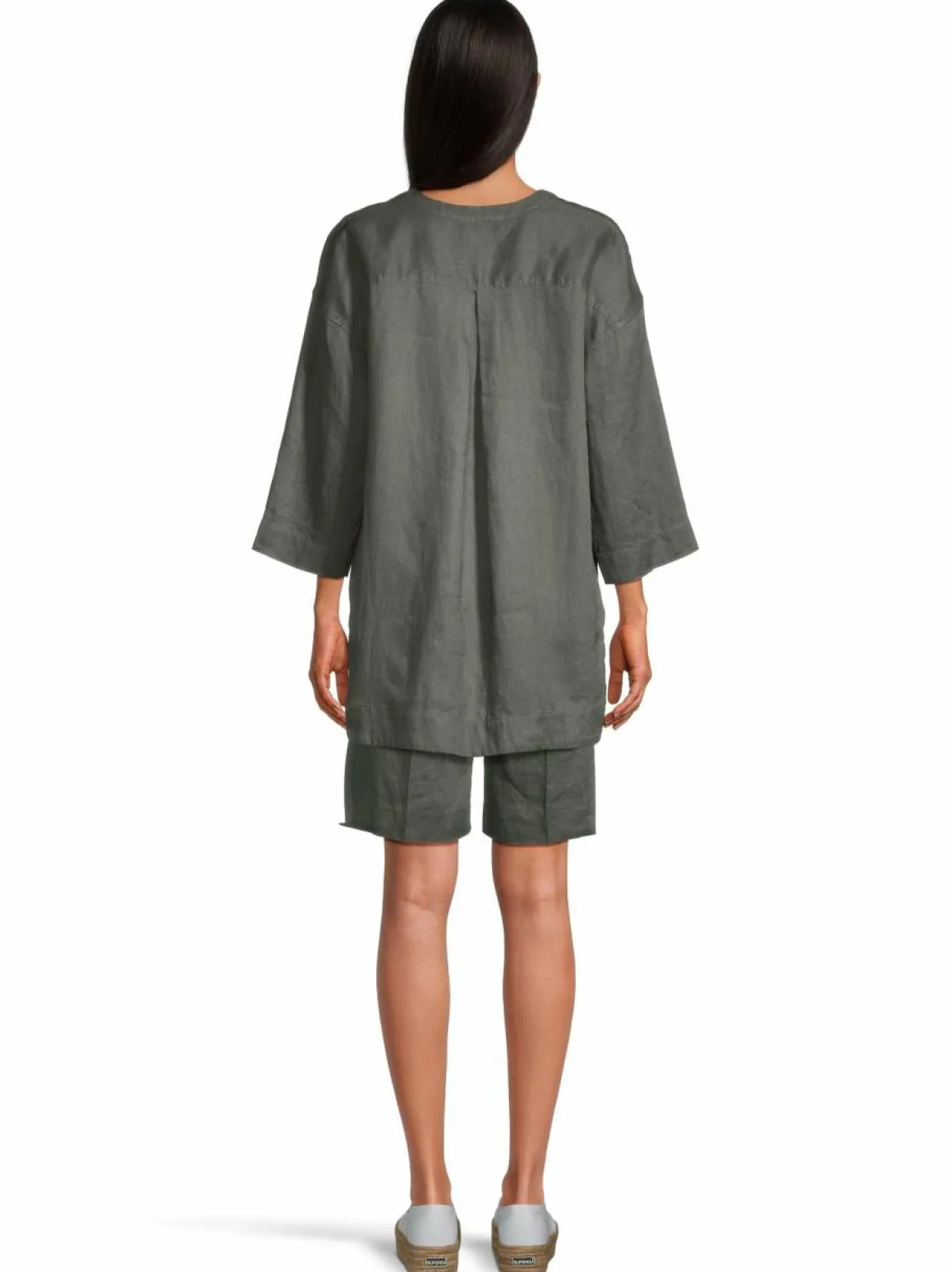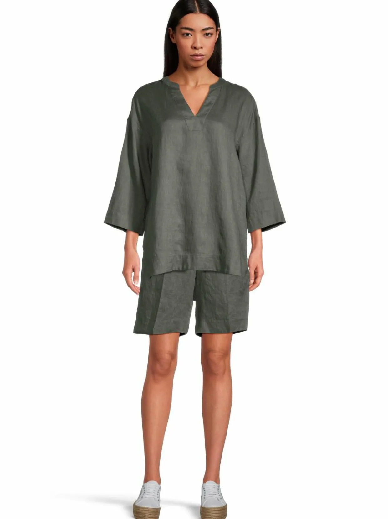 Rennosti laskeutuva Amalia-pellavatunika on takaa hieman pidempi kuin edestä. Pellava on luonnollinen ja ihanan viileän tuntuinen materiaali – oikein hoidettuina pellavavaate kestää vuosia hyvässä kunnossa. Tunikassa on puolipitkät hihat, pienet helmahalkiot ja imarteleva v-pääntie. Helma on hieman kaareva.