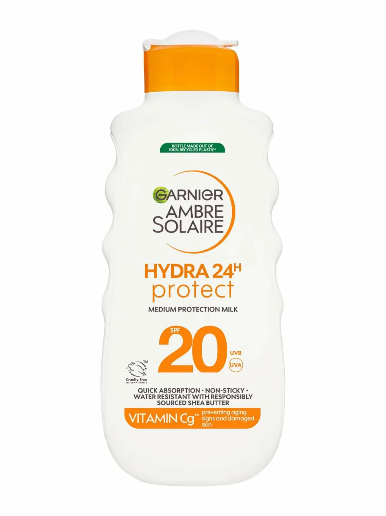 Garnier Ambre Solaire Hydra 24H Protect -aurinkosuojaemulsio SPF20 suojaa tehokkaasti UVA- ja UVB-säteitä vastaan. Kosteuttava koostumus auttaa suojaamaan auringon kuivattavalta vaikutukselta ja samalla voit nauttia pehmeästä ja kosteutetusta ihosta. Suodattimemme auttavat suojaamaan ihoasi auringonsäteiden haitallisia vaikutuksia vastaan: UVA: Taistelee ennenaikaisia ikääntymisen merkkejä ja pitkäaikaisia auringonsäteiden aiheuttamia ihovaurioita vastaan. UVB: Suojaa auringon säteiden aiheuttamia välittömiä ihovauriota vastaan. Tuote imeytyy nopeasti ja ei jätä tahmaista tunnetta. Tuote on vedenkestävä. Pullo on valmistettu 100 % kierrätetystä muovista. Tuote on eläinkokeeton.