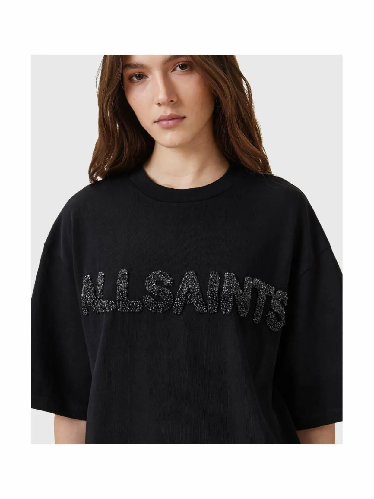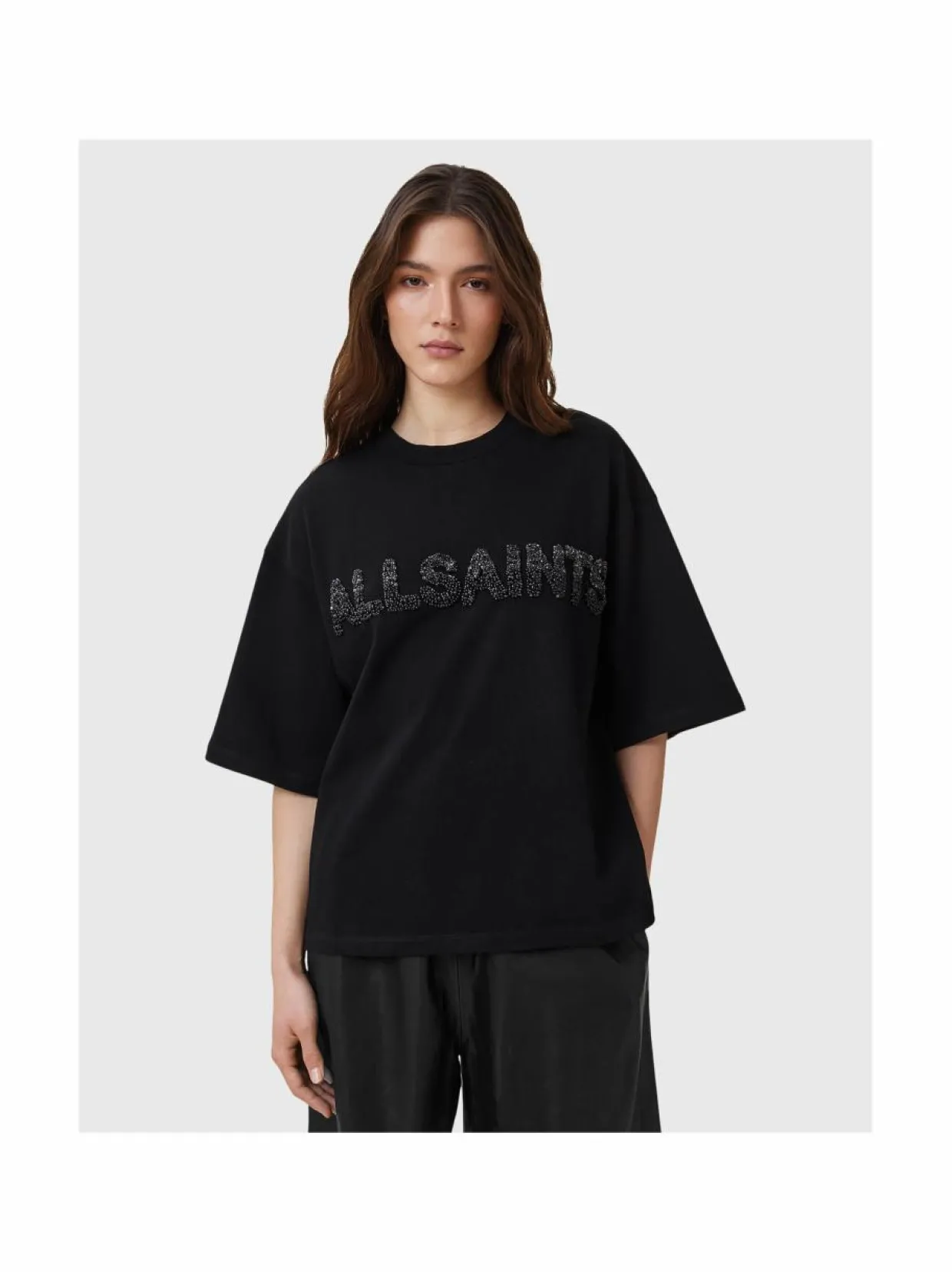 All Saints merkkinen Amelie Pearl t-paita on suunniteltu mukavaan istuvuuteen. Se on valmistettu pehmeästä puuvillasta. Hartialinja on madallettu rennon siluetin korostamiseksi. Yksityiskohtana helmikoristeinen logoteksti.